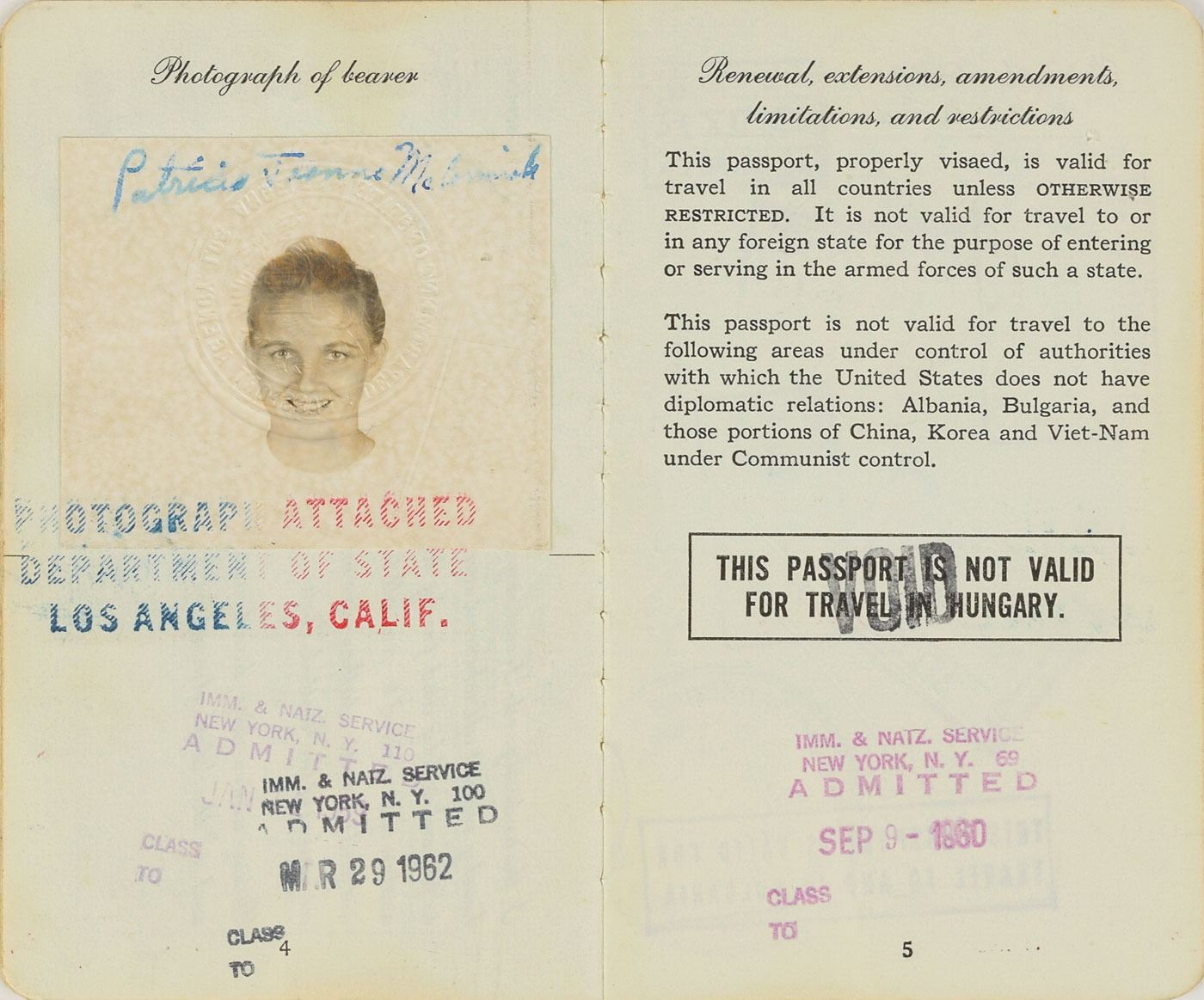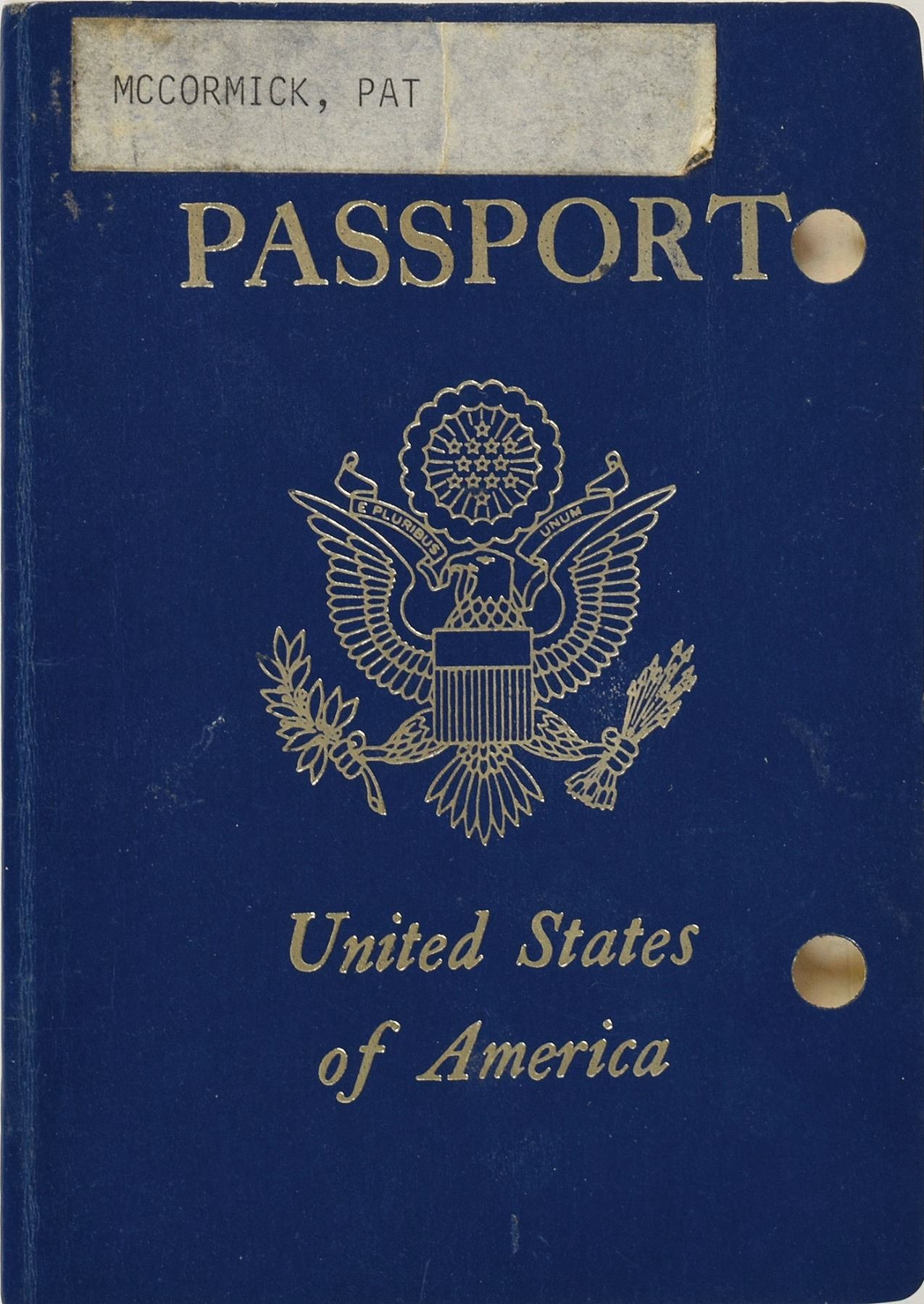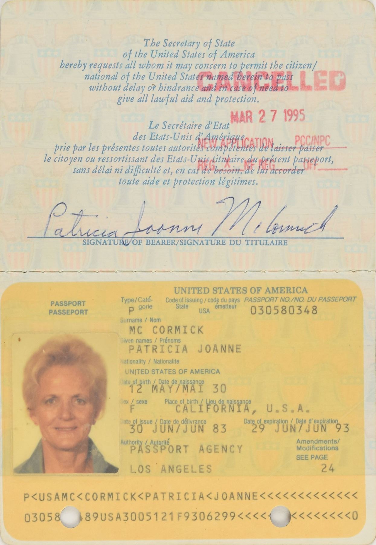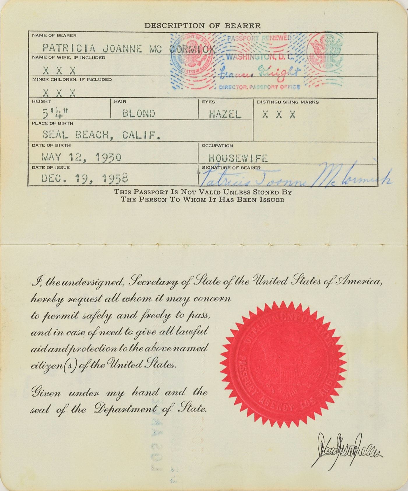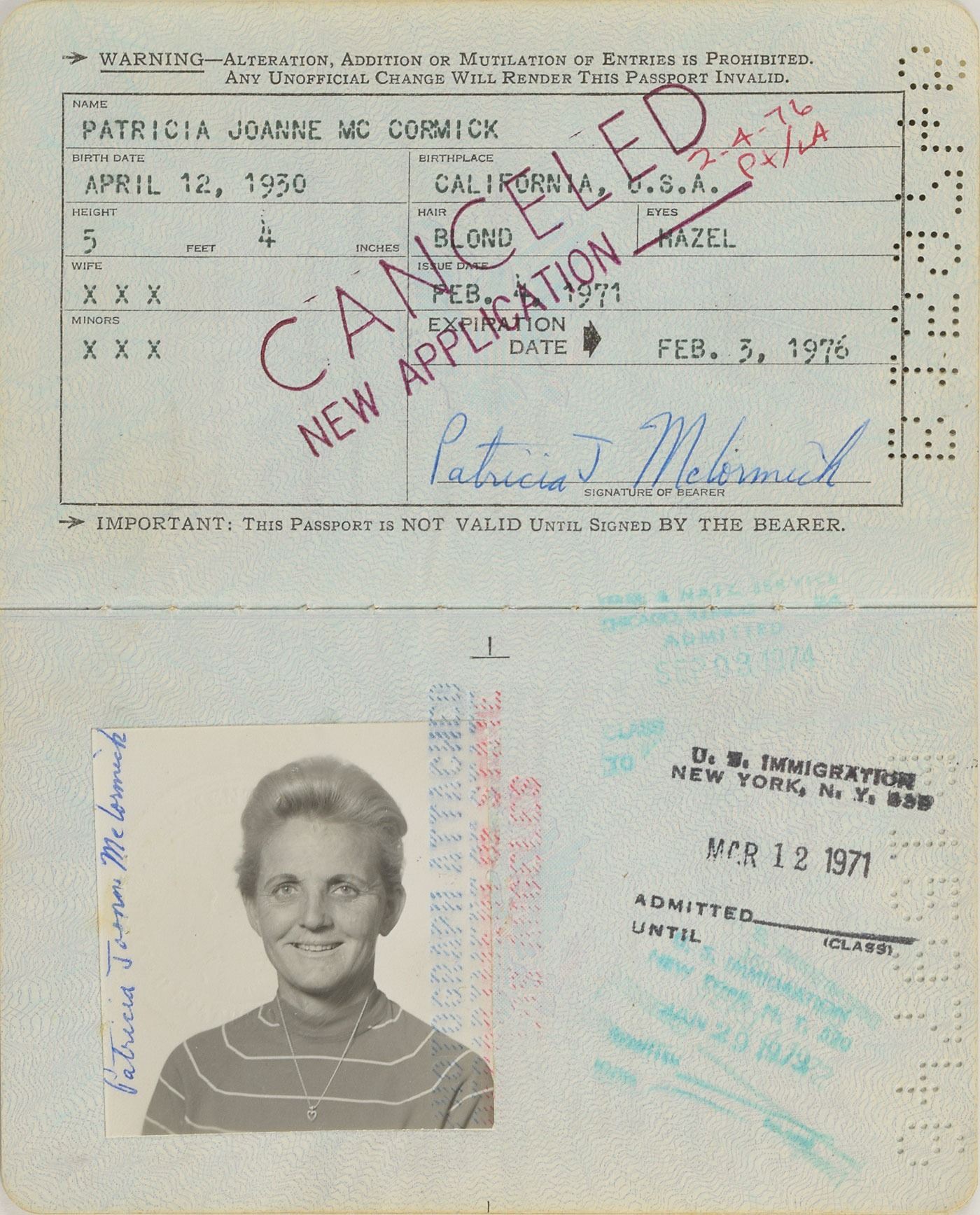 American diver (born 1930) who won a total of four gold medals when she swept the springboard and platform diving events at the 1952 and 1956 Olympics at Helsinki and Melbourne. Group of three of McCormick's personal passports: one with an issue date of December 19, 1958, signed on her personal information page and passport photo, "Patricia Joanne McCormick"; one with an issue date of February 4, 1971, signed on the info page, "Patricia J. McCormick," and on her passport photo, "Patricia Joanne McCormick"; and one with an issue date of June 30, 1983, signed on the first page, "Patricia Joanne McCormick." All bear a multitude of foreign passport stamps inside. In overall fine condition, with expected wear from use.