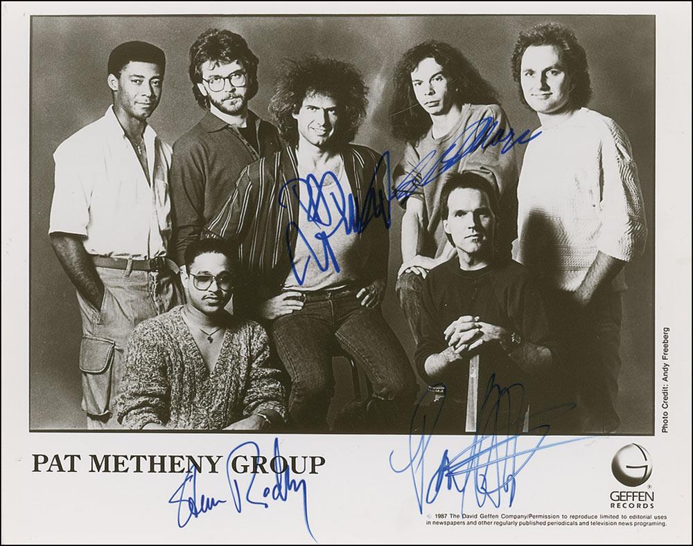 Satin-finish 10 x 8 Geffen Records publicity photo, signed in blue felt tip by four members including Pat Metheny, Steve Rodby, and Paul Wertico. In fine condition.