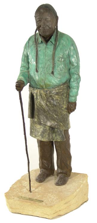 Patinated color limited edition (#8/12) bronze sculpture on sandstone base. 25" x 9" x 9-1/4"