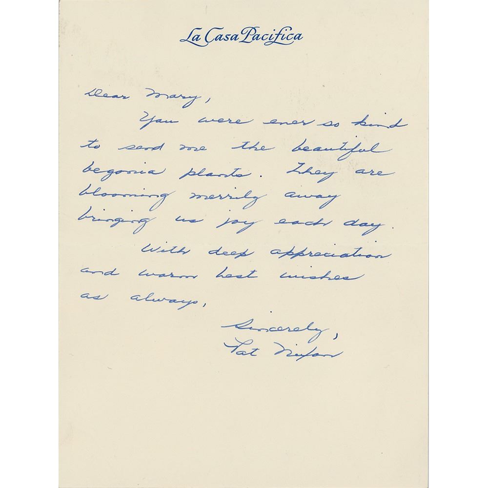 ALS, one page, 5.5 x 7.5, La Casa Pacifica letterhead, no date. Handwritten letter to "Mary," in part: "You were ever so kind to send me the beautiful begonia plants. They are blooming merrily away bringing us joy each day." In fine condition.