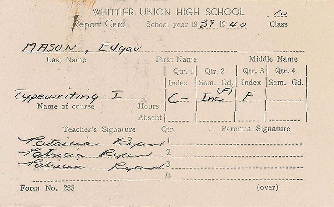 Partly-printed DS, signed three times, “Patricia Ryan,” one page, 5 x 3, circa 1939–1940. Edgar Mason's Whittier Union High School "Typewriter I" course card, chronicling his descent into failure as a typist: he receives a C- in the first quarter, incomplete (F) in the second, and an F in the third, with the last quarter left blank. The future first lady signs three times using her maiden name. In fine condition, with a rusty paperclip impression to the top edge. It was while in Whittier that Pat Ryan met Richard Nixon, a newly minted lawyer; they married on June 21, 1940, at the Mission Inn in Riverside, California.