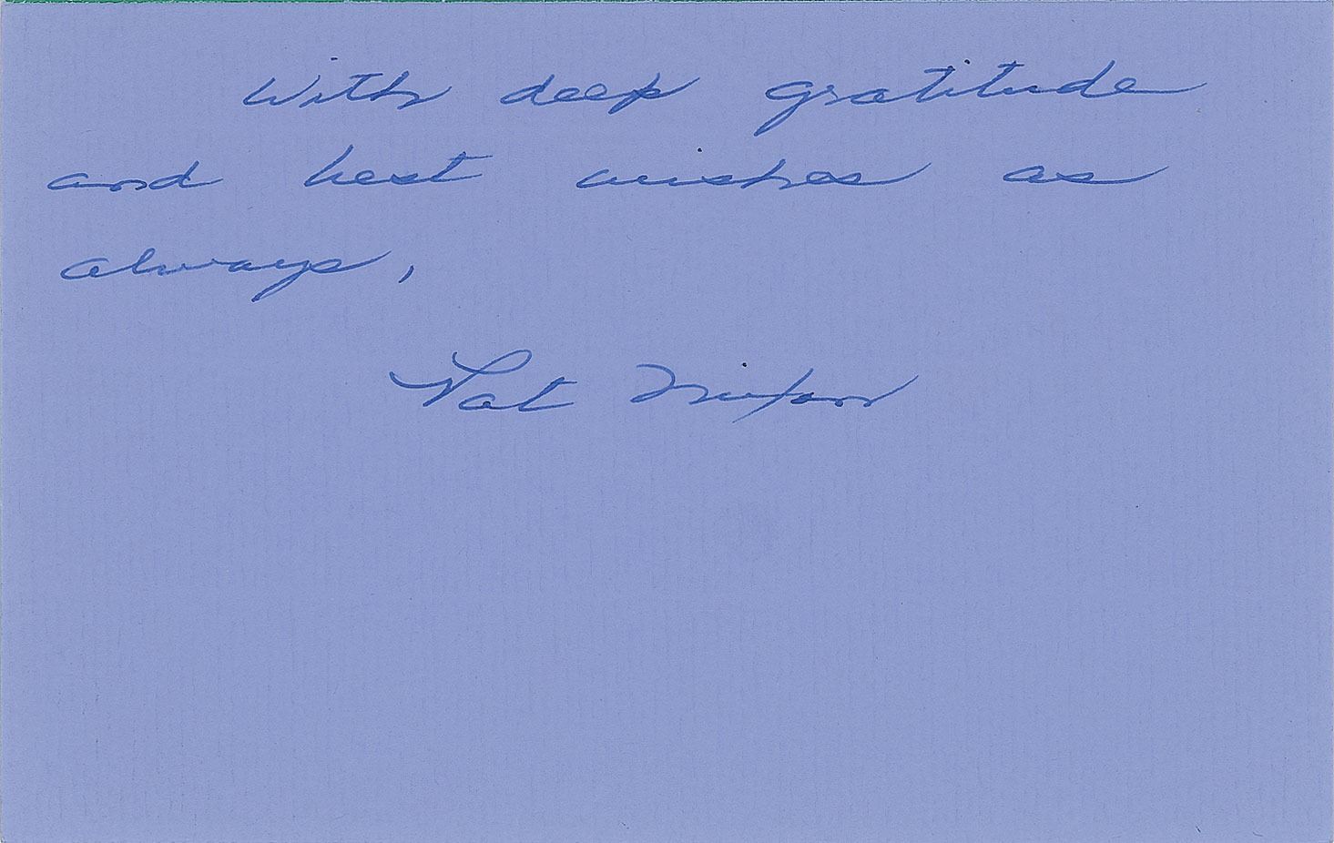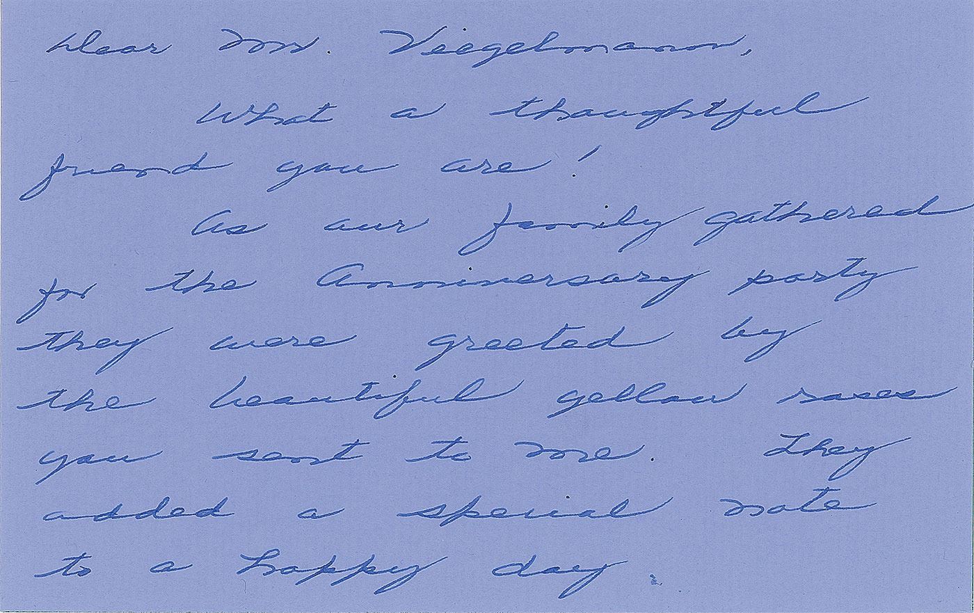 ALS, one page both sides, measuring 6 x 7.5 open, personal stationery card, no date. Letter to George Viegelmann, in full: "What a thoughtful friend you are! As our family gathered for the Anniversary party they were greeted by the beautiful yellow roses you sent to me. They added a special note to a happy day. With deep gratitude and best wishes as always." In fine condition.
