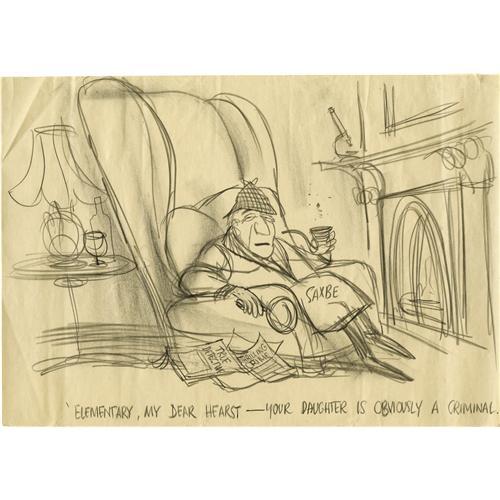 <B>Pat Oliphant - Patty Hearst/Attorney General William Saxbe Editorial Cartoon Preliminary Drawing Original Art, dated 4-24-74 (L. A. Times Syndicate, 1974)</B></I>. Called "the most influential cartoonist now working" by <B>The New York Times</B></I>, Pat Oliphant practically reinvented the modern editorial cartoon. The saga of Patty Hearst and the Symbionese Liberation Army served as the theme for this preliminary sketch for a finished cartoon. When the now-famous pictures of Hearst as Tania, wearing a beret and carrying a rifle, were taken during the SLA raid on the Hibernia National Bank, Attorney General William Saxbe labeled her a "common criminal." Hearst called herself "a soldier in the people's army." The overall size of this pencil on newsprint drawing measures 11" x 12" and the art is in Good condition. A photocopy of the finished cartoon is included in this lot. <I>From the Estate of Bruce Hamilton.</B></I> <BR><BR><B>Important notice:</B> Heritage usually auctions material at the rate of 200-250 lots per hour. On some occasions eBay Live bid software or the Internet may not be able to keep up with the pace of the auction. We recommend placing a realistic absentee bid now as insurance to avoid disappointment. Occasionally the auctioneer may eliminate or reject an eBay Live bid, and the auctioneer may also reopen a lot after the close of the eBay live bidding (usually because we missed an audience bid), and may reject your bid even if it shows you as the winning bidder. By bidding via eBay Live, you agree that Heritage may award the lot to another bidder at its sole discretion under the circumstances described above or any other reasonable circumstances. Since eBay bids are not shown to us until we open the lot on the floor, we treat those bids just like floor bids. In most cases the floor responds before the eBay bid is presented to us, due to Internet lag time, so for consistency we have made it a policy that floor bids are always considered first over tie eBay live bids. Also please note that all Heritage lots purchased through eBay Live carry a 22.5% Buyer's Premium. Please make sure you read the Terms and Conditions before you bid. This lot is being auctioned in conjunction with a live floor auction by Heritage Auction Galleries. All final auction and invoice information will be supplied by Heritage Auction Galleries, and all other information should be considered preliminary. Lot:41001 <BR><BR><B>Winning Notification and Billing:</B> After the FINAL session in this auction is complete, Heritage will send e-mail and snail mail invoices. This process normally takes several days. All final auction and invoice information will be supplied by Heritage Auction Galleries, and all other information should be considered preliminary. <BR><BR>This auction will be conducted on a live auction floor and over the Internet through eBay Live. If you choose to place an absentee bid, please take a moment to <font color='#0000ff'><u><a href='http://pages.ebay.com/liveauctions/help/before/laabsentee.html'>learn how eBay Live absentee bidding works</a></u></font><font color='#000000'>