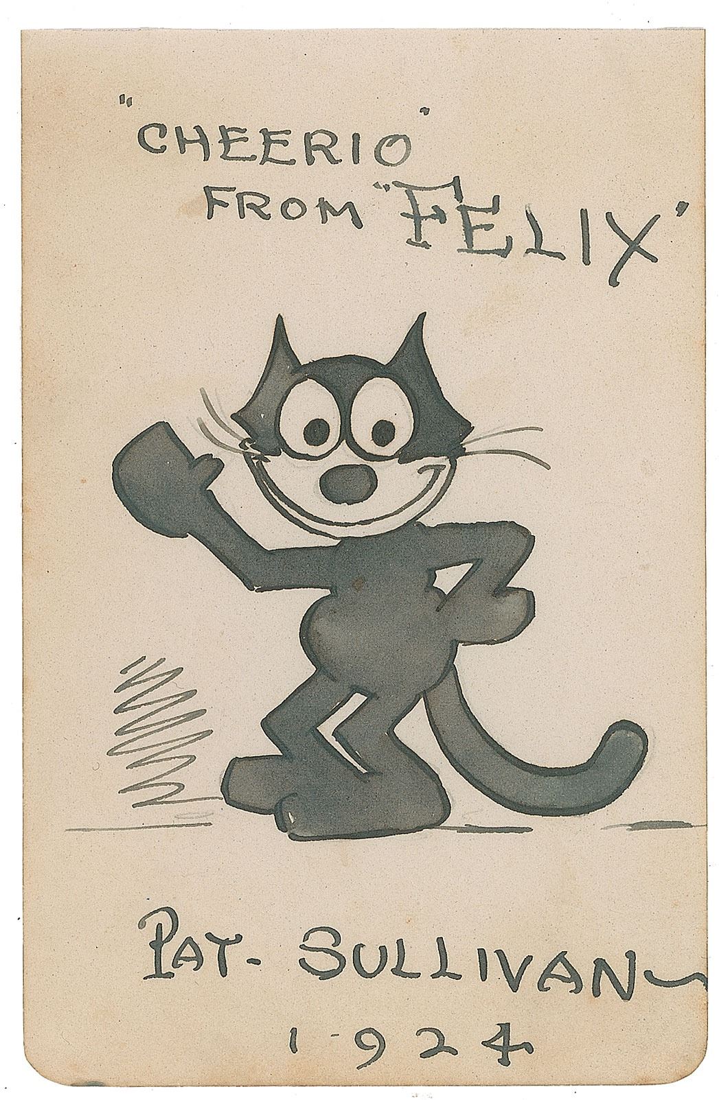 Rare original ink sketch of Felix the Cat accomplished by Sullivan on an off-white 3.5 x 5.5 album page, nicely signed in ink, "'Cheerio' from Felix, Pat Sullivan, 1924." In fine condition.