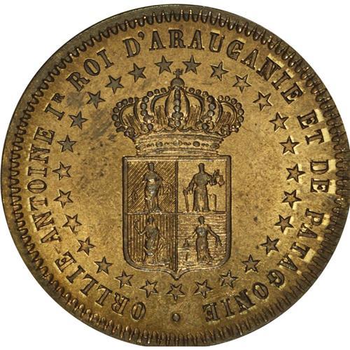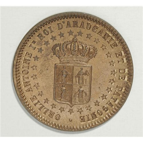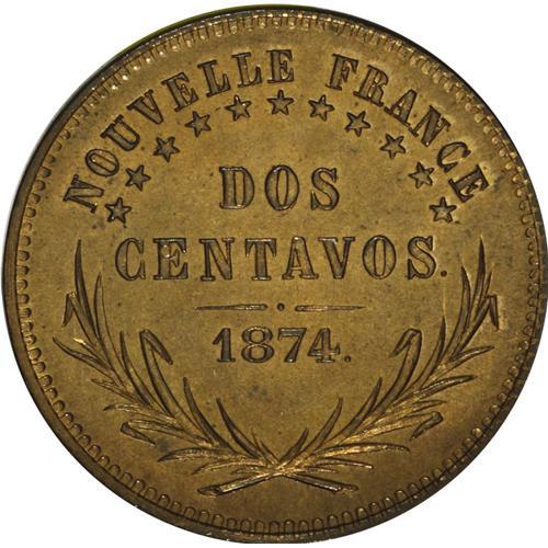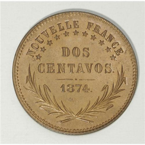 <B>Patagonia. 2 Centavos 1874 Copper Pattern, </B></I>VG-3859, choice brilliant UNC, struck for "Nouvelle France" at the Paris Mint. Scarce and very popular issue.<BR><I>From the Louis E. Eliasberg, Sr. Collection</B></I><BR><BR><b>Shipping:</b> Coin/Currency (<a target="_blank" href="http://www.heritageauctions.com/common/shipping.php">view shipping information</a>)