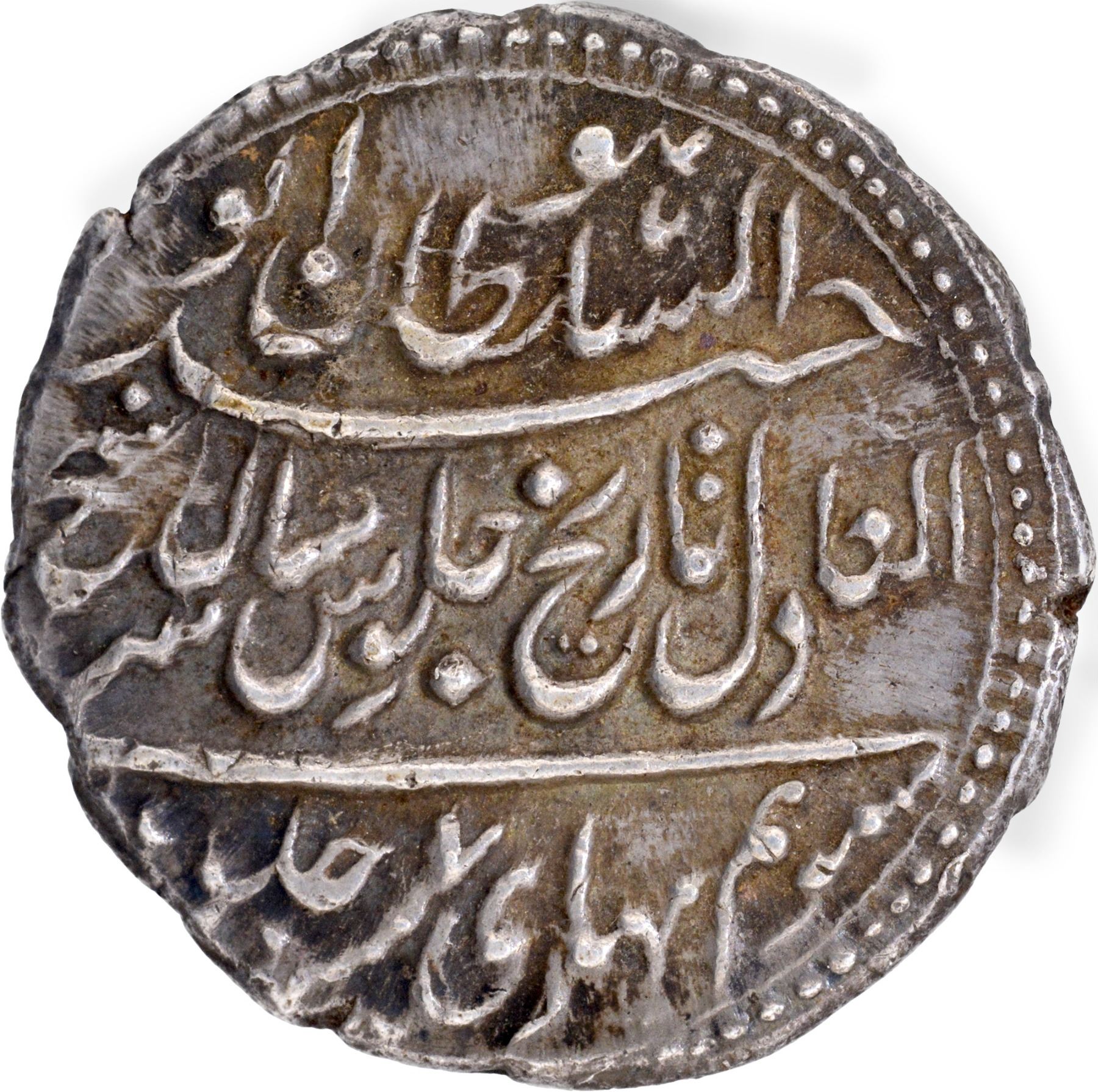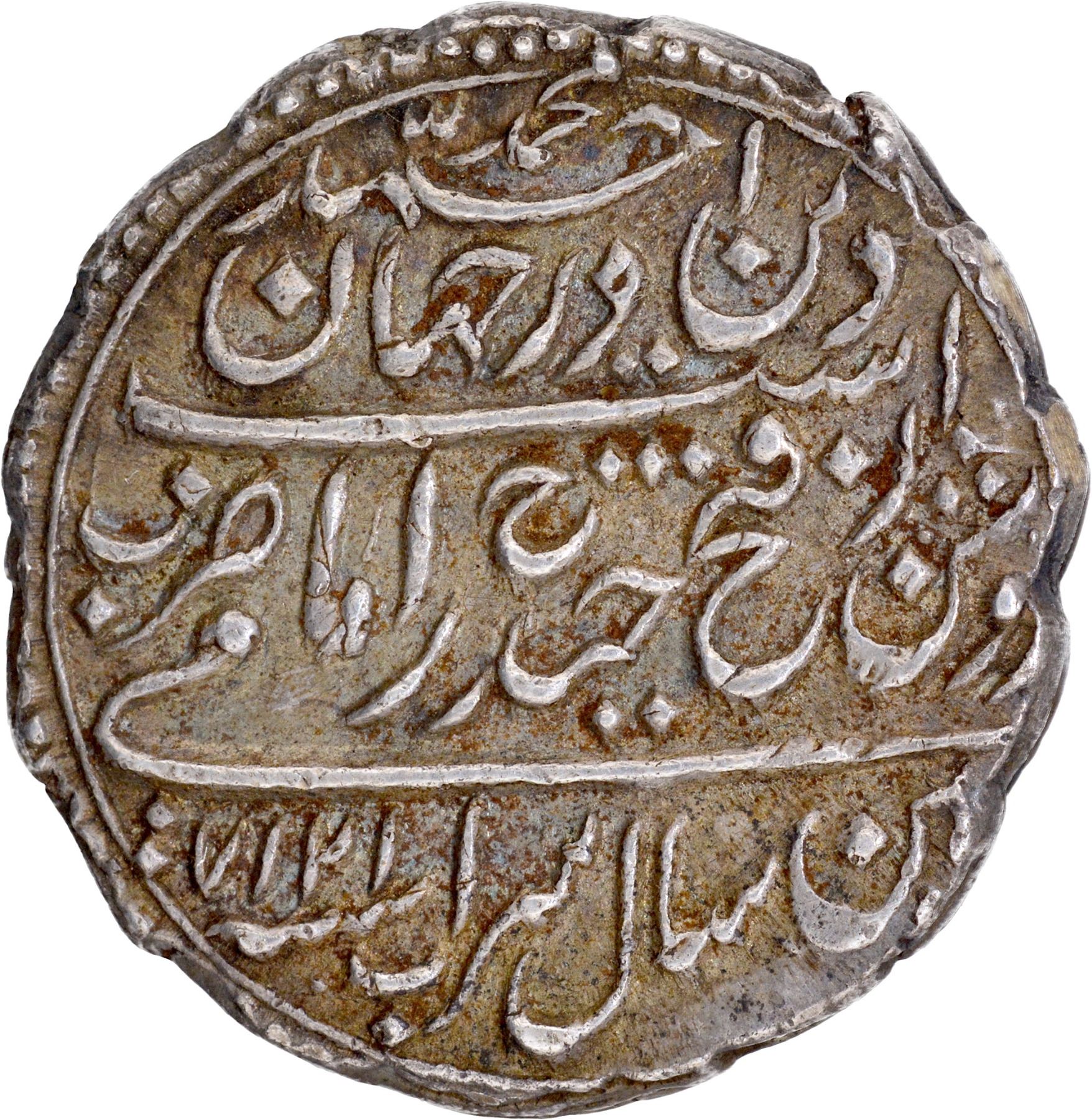 Mysore Kingdom, Tipu Sultan (AH 1197-1213 /AM 1215-1227 /1787-1799 AD), Patan (Seringpatan) Mint, Silver Rupee (Imami), AM 1217/7 RY, Mauludi Era, Saal Sarab, Obv: Persian legend deen-e-Ahmad Muhammad dar Jahan Roshan ze Fatah Haidar ast, Imami, zarb Patan, saal sarab, Sana 1217 AMwith the initial letter Ha in the center, Rev: Arabic legend huwas sultan al Waheed al Adil, Tarikh julus, saal sakh, suwem Bahari Sana 7julusi, 11.32g, 24.61, (KM # 126), partial dotted border on both sides, choice extremely fine,Rare.