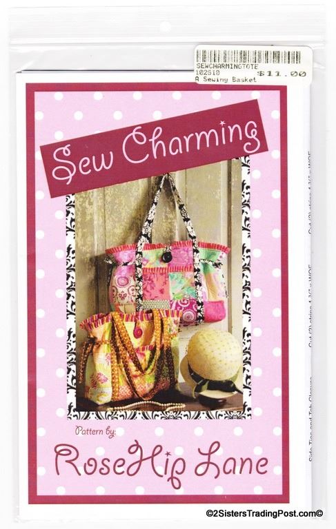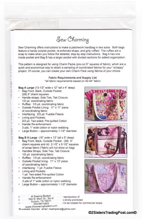 Pattern is for a patchwork handbag by Rose Hip Lane pattern is for two sizes bag A large 13.5" wide x 12" tall x 4" deep bag B XL 16" wide x 13" tall x 5" deep. Both bags feature an outside pocket, re-enforced straps and girly ruffles. MSRP $10.50