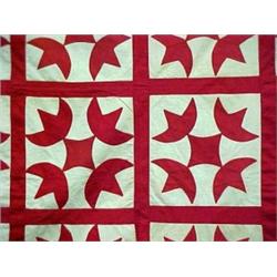 Patchwork quilt top, "Tulip Variation", in red and cream, hand stitched, slight staining, measures approximately 80" x 80" Estimate 80/160