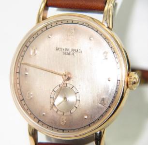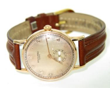 Patek Philippe 18K Rose Gold Brown Leather Strap Watch The total watch's weight is 33.2 grams. The measurements of watch head is 30 x 30 mm and 6 mm thick Rose Gold dial with florale gold Arabic numeral hour markers. Small seconds subdial at 6 o'clock position. Scratch resistant sapphire crystal. The length of watch: 9" water Resistant swiss made