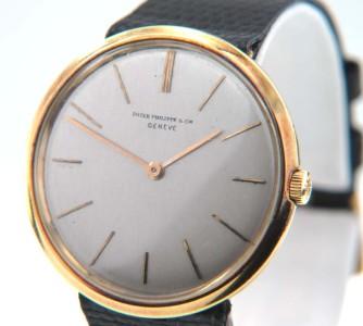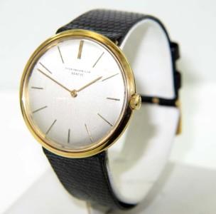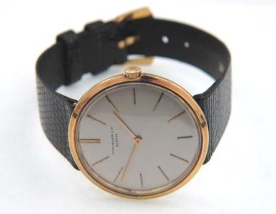 Patek Philippe 18K Yellow Gold Leather Strap Watch The total watch's weight is 36.3 grams. The measurements of watch head is 29 x 33 mm and 5 mm thick. Dial: Gold Stick dial Movement: Manual The length of watch: 9" water Resistant swiss made
