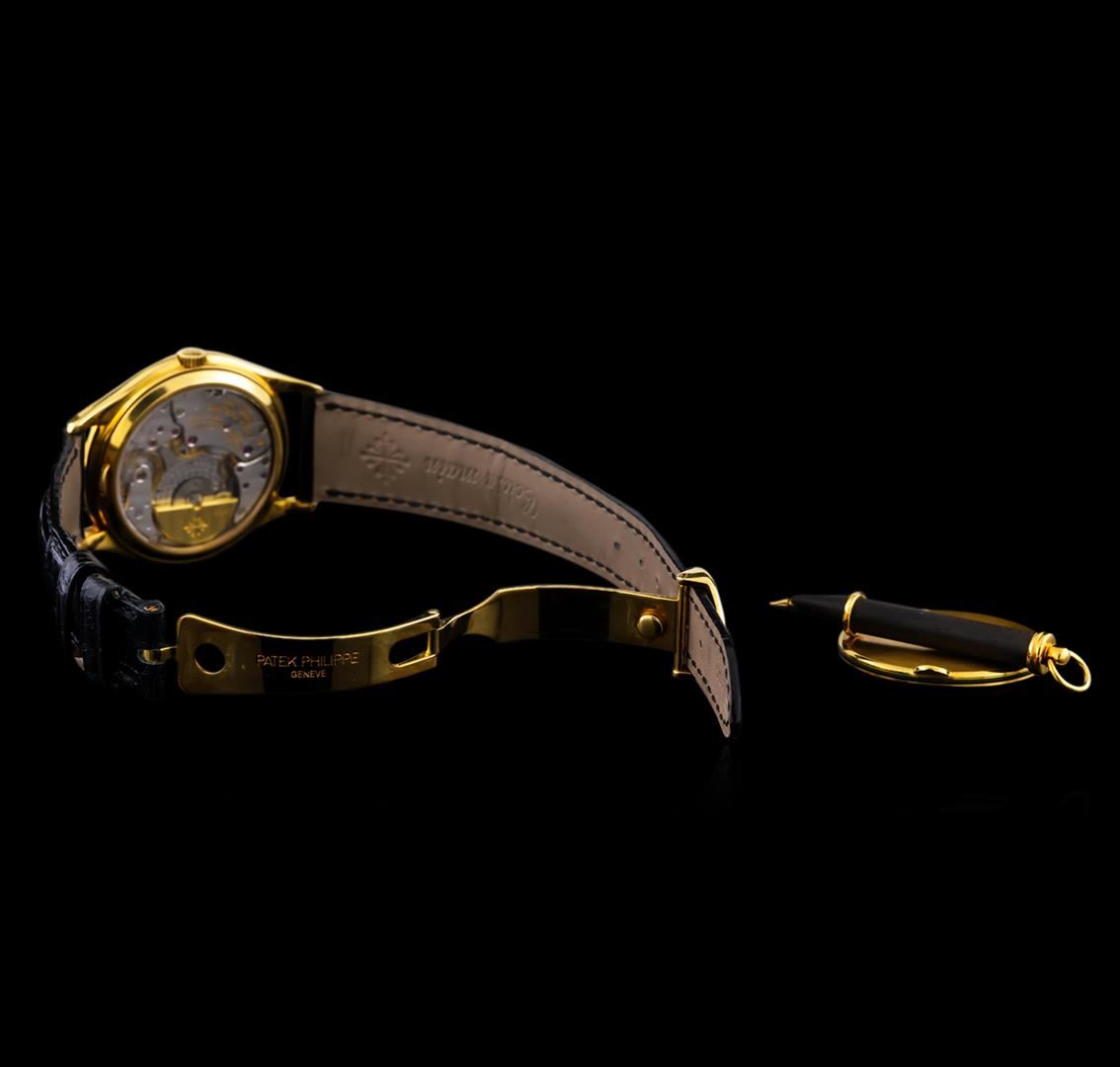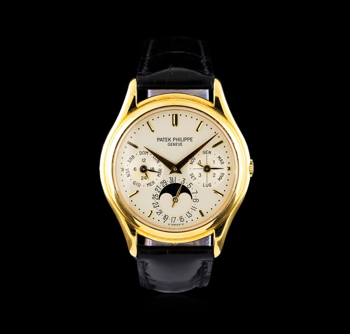 One Patek Philippe Perpetual Calendar men's watch featuring: Movement: Automatic. Case: 18KT yellow gold and sapphire crystal display (second solid gold case back is included and in great condition). Case Shape: Round. Bezel: 18KT yellow gold. Crystal: Sapphire. Dial: Light silver color; applied golden hour markers; embossed minutes chapter; golden dauphine hands. Features: Perpetual calendar and moon phases; month and leap year subdial located at the 3 o'clock position; moonphase and date subdial located at the 6 o'clock position; day and 24 hour time subdial located at the 9 o'clock position. Bracelet: Original Patek Philippe black leather strap with 18KT yellow gold deployment buckle. Condition: Barely noticeable tiny surface scratches on buckle, but otherwise in great condition. Comes with setting stylus. Please note the month and days of the week features on the watch are in Italian.
