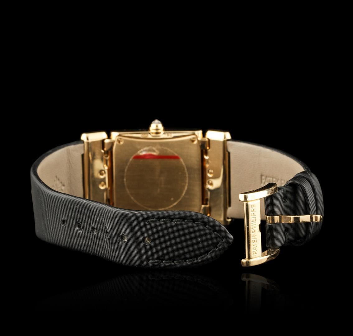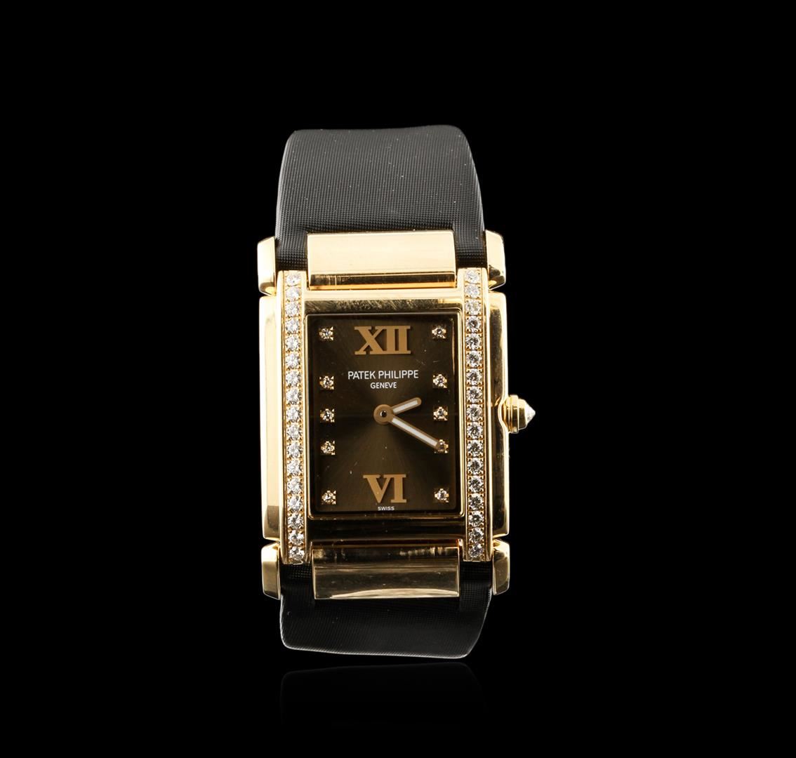 One, Patek Philippe "Twenty 4" wristwatch electronically tested 18KT rose gold, Case: 25 x 25mm, Water Resistant: 30 meters / 100 feet, Case Back: secured by four set screws, Crown: set with an inverted diamond, Bezel: set with diamonds, Crystal: synthetic sapphire, Movement: Patek Philippe Swiss quartz. Dial: Chocolate Dream, with luminous baton hands, diamond indices and two Roman numerals, Bracelet: "Twenty 4" Dark Satin over leather, Condition: G-5 Fine. Seven inch length, adjustable. Patek Philippe 18KT rose gold buckle. Containing: Thirty Four round brilliant cut diamonds, approximate total weight equals 0.68ct. Clarity VVS-1 to VVS-2. Color: E - F. Total Weight of Diamonds 0.68ct. Weight of Watch 59.09 grams. AIG Appraised at $24,000.00.