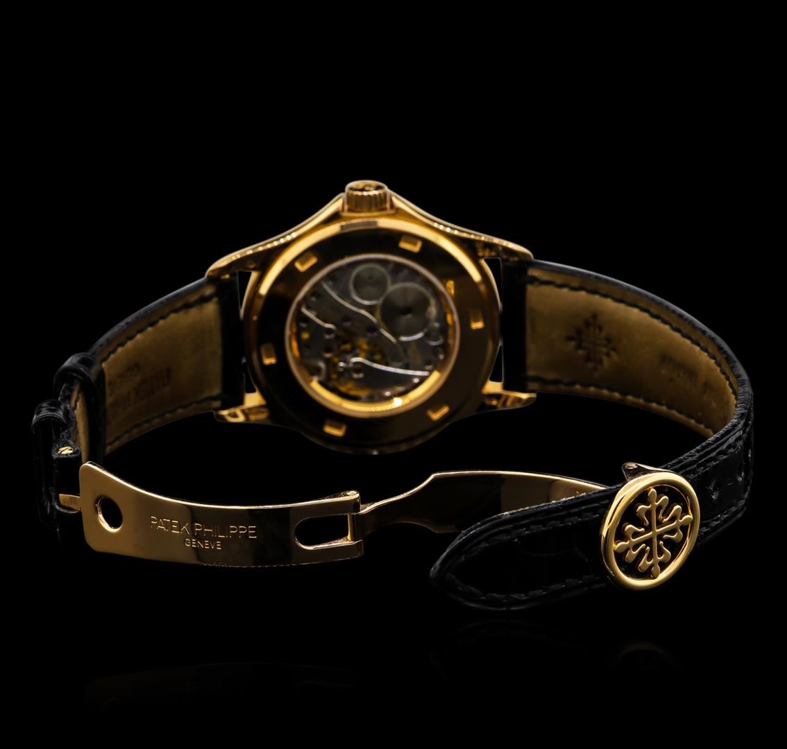 One, Patek Philippe Travel Time wristwatch electronically tested, 18KT Rose gold, Case: 38mm diameter, Swiss Hallmarked Case Back: synthetic sapphire exhibition, Water Resistant: 30 meters / 100 feet, Bezel: high polish finish, Crown: scalloped, with and a high relief logo, set within raised protective shoulders, Crystal: synthetic sapphire lens. Patek Philippe Geneva Switzerland Hallmarked Movement: eighteen jewel automatic, five adjustments including isochronism. Patek Philippe signed Dial: White color, pointed hands & raised numerals, separated by a bordering minute track, secondary time zone hand, a 24-hour "Home Time" indicator, and a small second's function. Patek Philippe Bracelet: saddle stitched leather strap, Condition: G-7 Near Mint. Eight inch length, adjustable. Patek Philippe 18KT Rose gold concealed deployment clasp, with logo. Total Weight of Watch 91.52gm. AIG Appraised at $22,000.00.