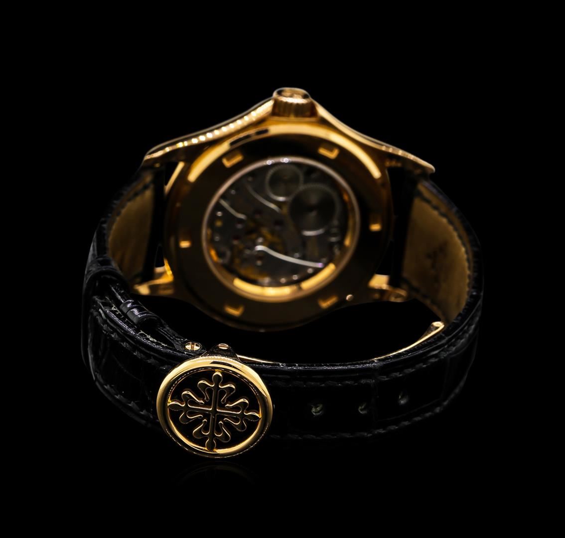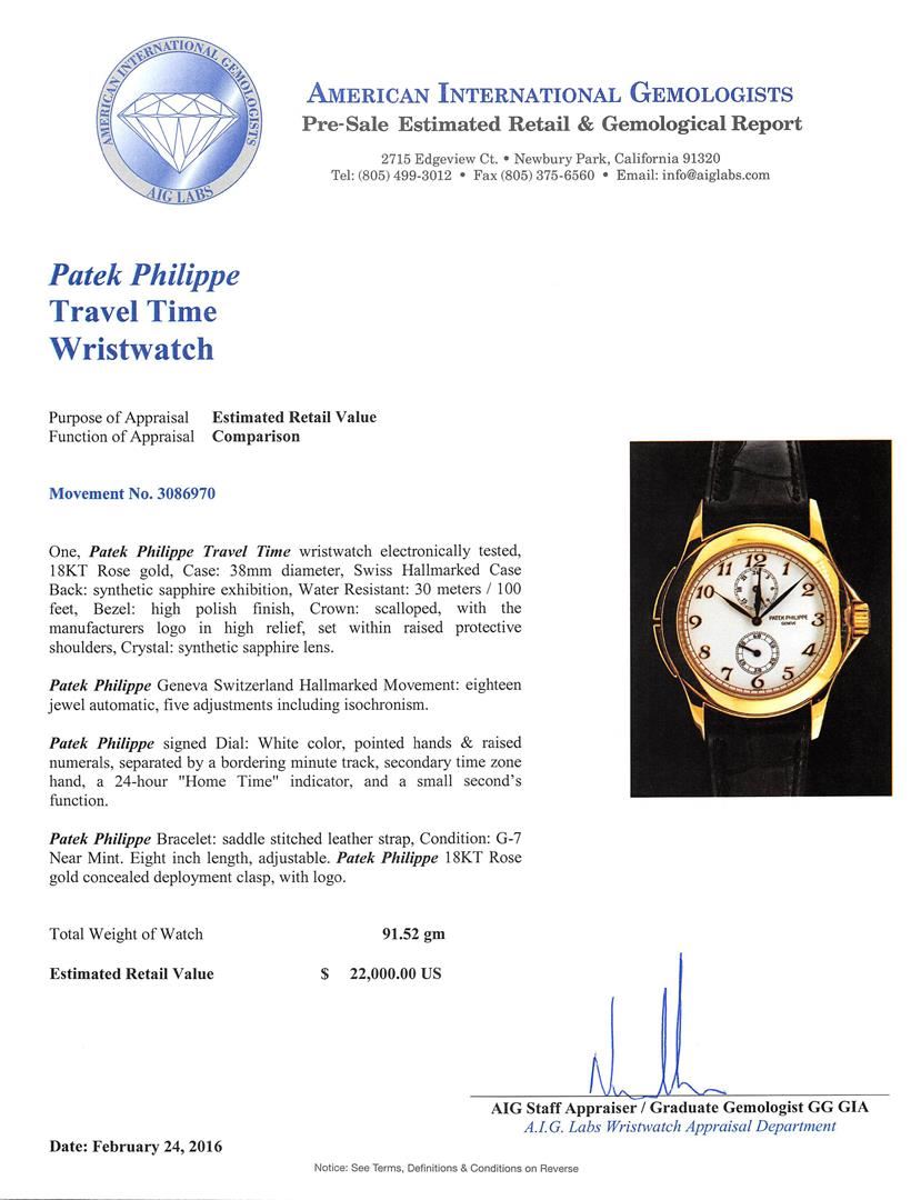 One, Patek Philippe Travel Time wristwatch electronically tested, 18KT Rose gold, Case: 38mm diameter, Swiss Hallmarked Case Back: synthetic sapphire exhibition, Water Resistant: 30 meters / 100 feet, Bezel: high polish finish, Crown: scalloped, with and a high relief logo, set within raised protective shoulders, Crystal: synthetic sapphire lens. Patek Philippe Geneva Switzerland Hallmarked Movement: eighteen jewel automatic, five adjustments including isochronism. Patek Philippe signed Dial: White color, pointed hands & raised numerals, separated by a bordering minute track, secondary time zone hand, a 24-hour "Home Time" indicator, and a small second's function. Patek Philippe Bracelet: saddle stitched leather strap, Condition: G-7 Near Mint. Eight inch length, adjustable. Patek Philippe 18KT Rose gold concealed deployment clasp, with logo. Total Weight of Watch 91.52gm. AIG Appraised at $22,000.00.