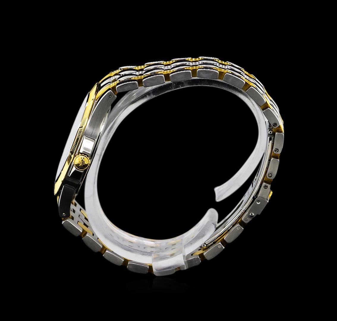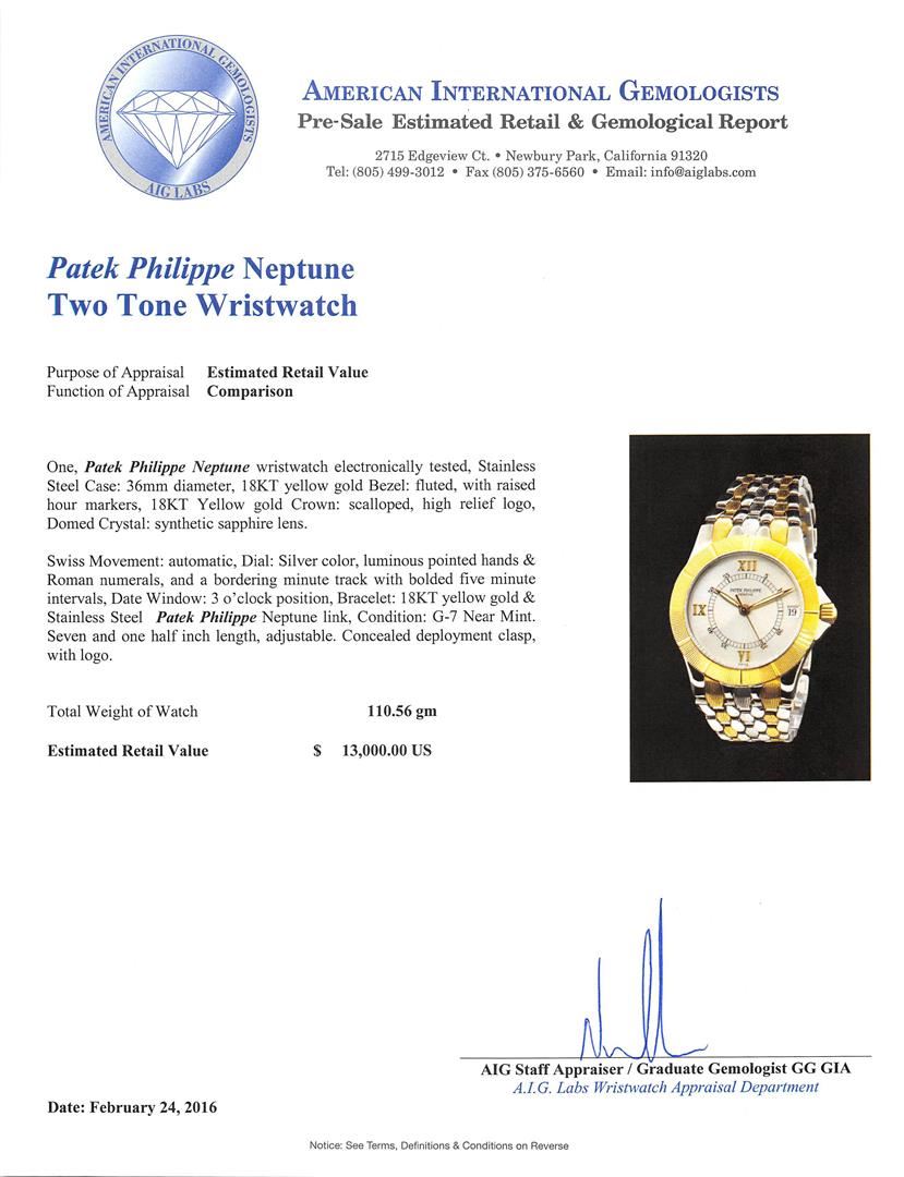 One, Patek Philippe Neptune wristwatch electronically tested, Stainless Steel Case: 36mm diameter, 18KT yellow gold Bezel: fluted, with raised hour markers, 18KT Yellow gold Crown: scalloped, high relief logo, Domed Crystal: synthetic sapphire lens. Swiss Movement: automatic, Dial: Silver color, luminous pointed hands & Roman numerals, and a bordering minute track with bolded five minute intervals, Date Window: 3 o'clock position, Bracelet: 18KT yellow gold & Stainless Steel Patek Philippe Neptune link, Condition: G-7 Near Mint. Seven and one half inch length, adjustable. Concealed deployment clasp, with logo. Total Weight of Watch 110.56gm. AIG Appraised at $13,000.00.