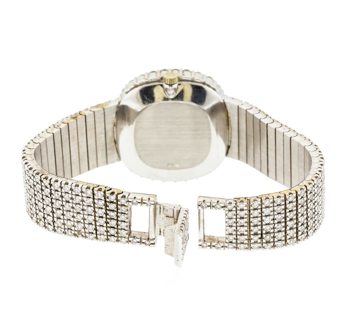 One gents, Patek Philippe wristwatch electronically tested 18KT White gold, Case: 25 x 25mm, Swiss Hallmarked Case Back: available space for engraving, Swiss Hallmarked Inner Case Back: engraved with the manufacturers name and ID numbers, Scalloped Crown: logo in high relief, Custom Bezel: diamond set, Crystal: synthetic sapphire lens. Condition: G-5 Fine. Movement: Patek Philippe mechanical, eighteen jewel with adjustments for heat & cold, Isochronism, and five position adjustments, Custom Dial: diamond set gallery, with pointed hands, Custom Bracelet: 18KT White gold, diamond set, Five and three quarter inch length. Three additional links are included with the watch, adding up to an inch in length. Containing: Approximately Five Hundred Eighty Eight prong set round brilliant & single cut diamonds, measuring from 1.10mm in diameter up to 2.50mm in diameter, approximate total weight of 588 Stones = 9.19ct. Graded in the setting. Clarity: VS-1 to SI-1 Average Color F - H. Total Weight of Diamonds 9.19ct. Total Weight of Watch 97.40gm. AIG Appraised at $35,000.00.