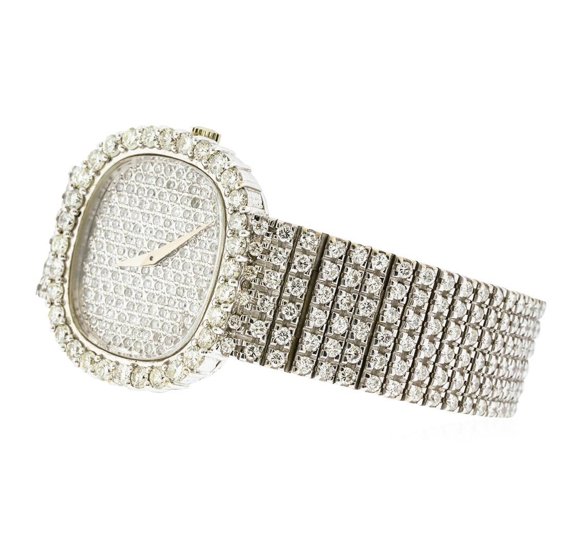 One gents, Patek Philippe wristwatch electronically tested 18KT White gold, Case: 25 x 25mm, Swiss Hallmarked Case Back: available space for engraving, Swiss Hallmarked Inner Case Back: engraved with the manufacturers name and ID numbers, Scalloped Crown: logo in high relief, Custom Bezel: diamond set, Crystal: synthetic sapphire lens. Condition: G-5 Fine. Movement: Patek Philippe mechanical, eighteen jewel with adjustments for heat & cold, Isochronism, and five position adjustments, Custom Dial: diamond set gallery, with pointed hands, Custom Bracelet: 18KT White gold, diamond set, Five and three quarter inch length. Three additional links are included with the watch, adding up to an inch in length. Containing: Approximately Five Hundred Eighty Eight prong set round brilliant & single cut diamonds, measuring from 1.10mm in diameter up to 2.50mm in diameter, approximate total weight of 588 Stones = 9.19ct. Graded in the setting. Clarity: VS-1 to SI-1 Average Color F - H. Total Weight of Diamonds 9.19ct. Total Weight of Watch 97.40gm. AIG Appraised at $35,000.00.