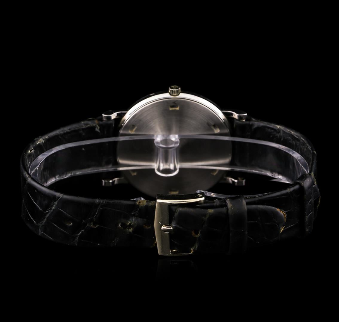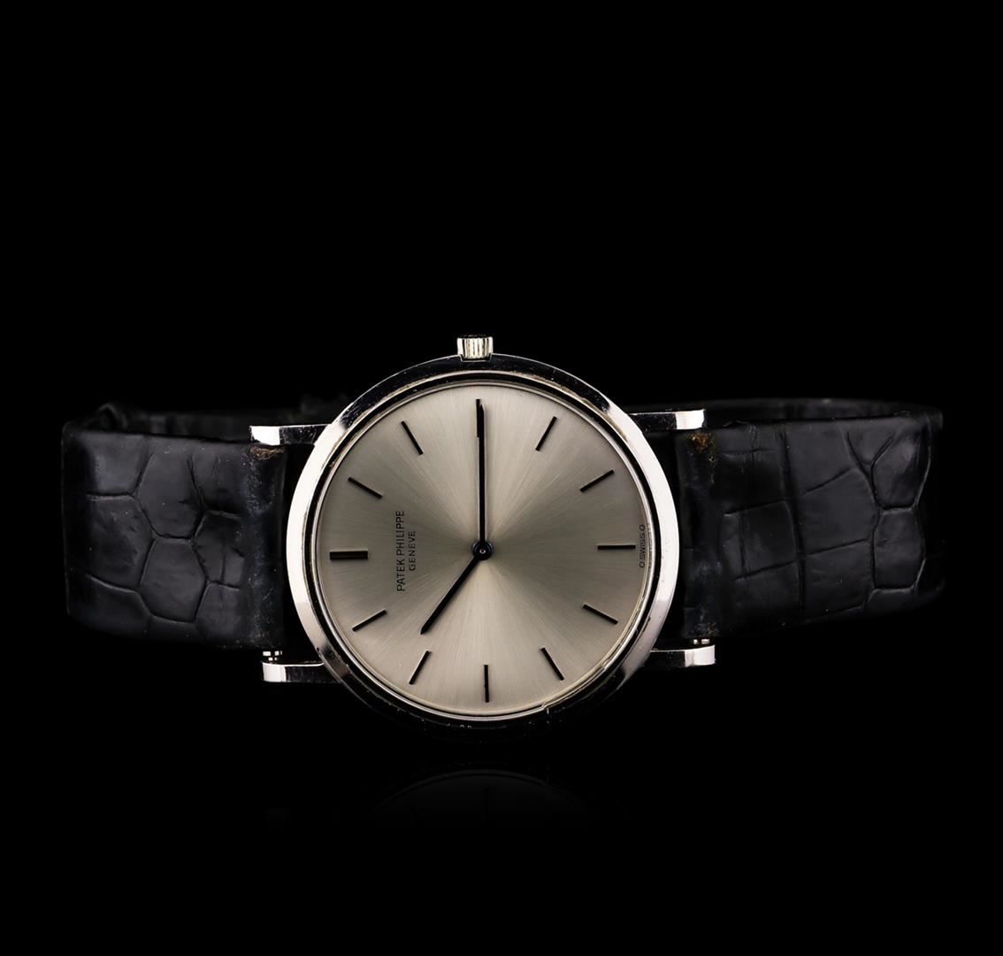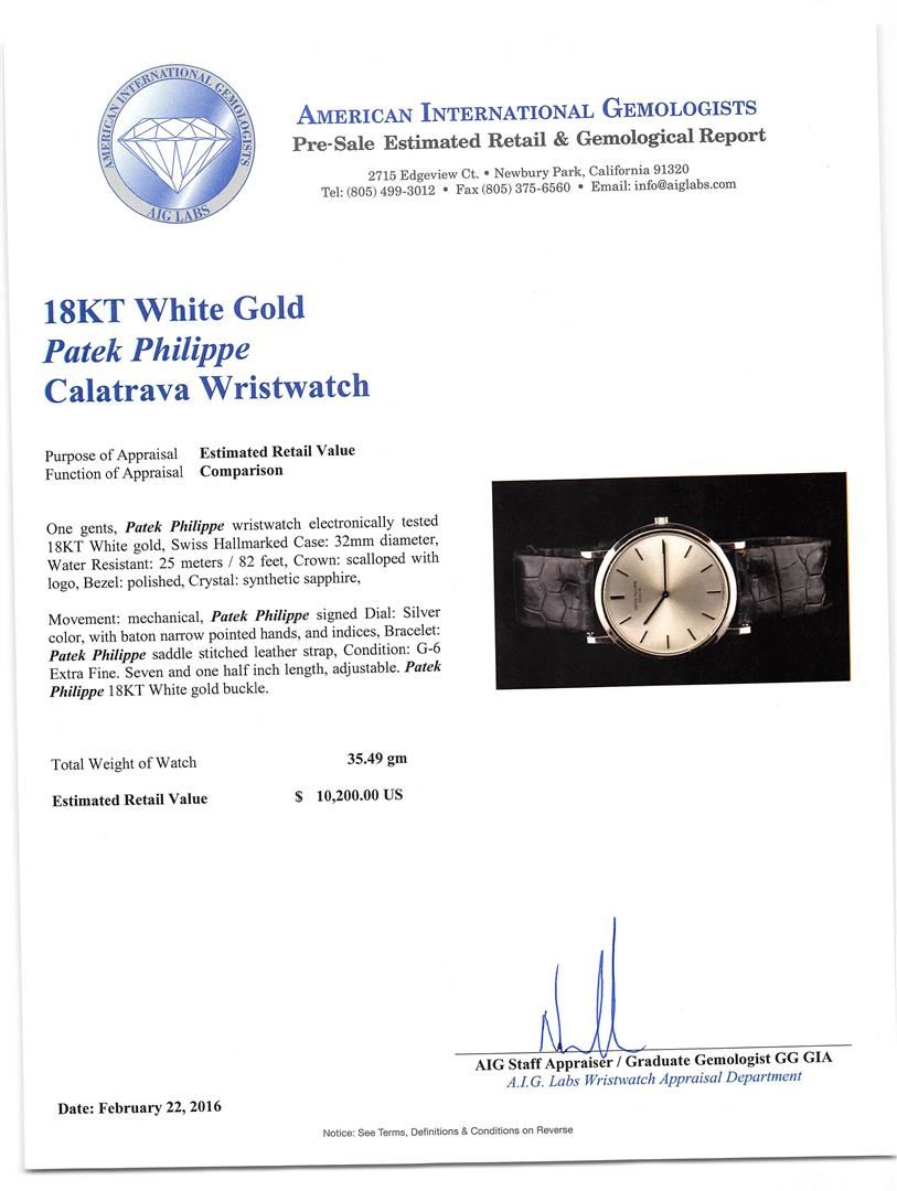 One gents, Patek Philippe wristwatch electronically tested 18KT White gold, Swiss Hallmarked Case: 32mm diameter, Water Resistant: 25 meters / 82 feet, Crown: scalloped with logo, Bezel: polished, Crystal: synthetic sapphire, Movement: mechanical, Patek Philippe signed Dial: Silver color, with baton narrow pointed hands, and indices, Bracelet: Patek Philippe saddle stitched leather strap, Condition: G-6 Extra Fine. Seven and one half inch length, adjustable. Patek Philippe 18KT White gold buckle. Total Weight of Watch 35.49gm. AIG Appraised at $10,200.00.