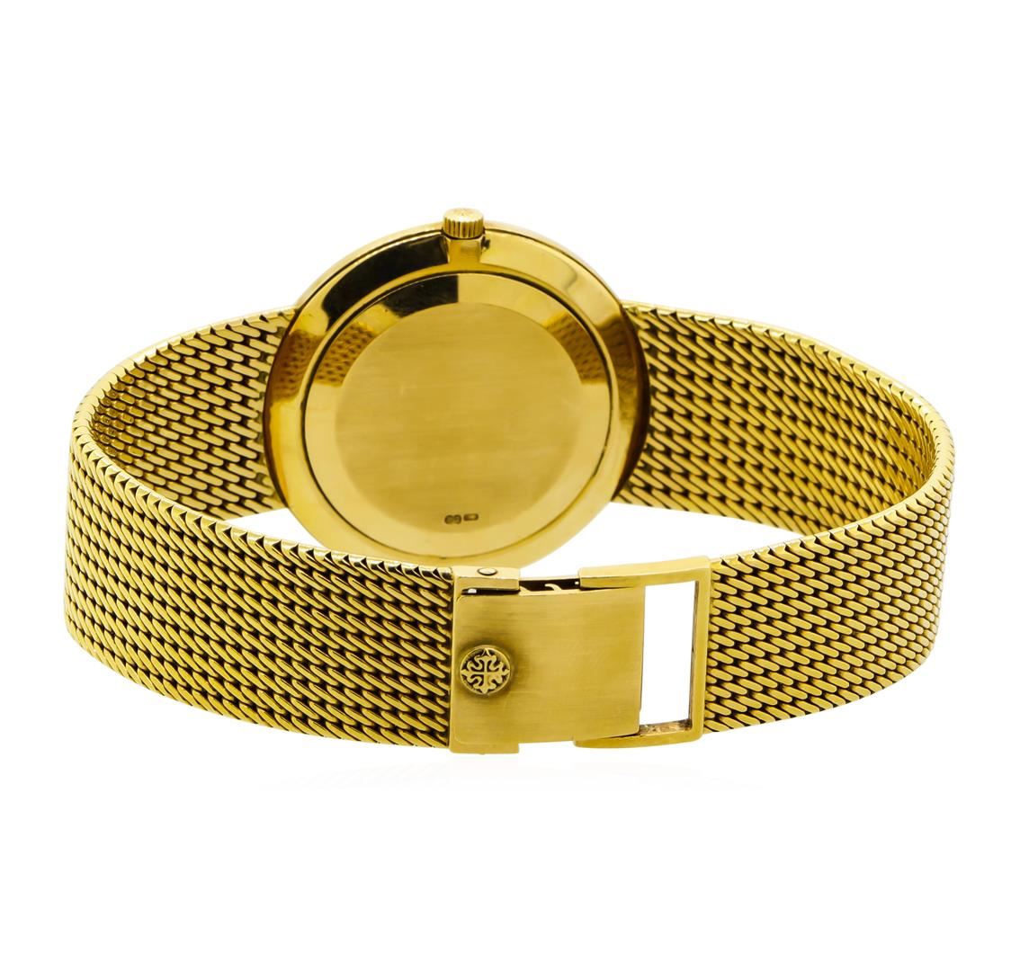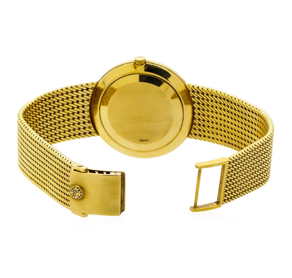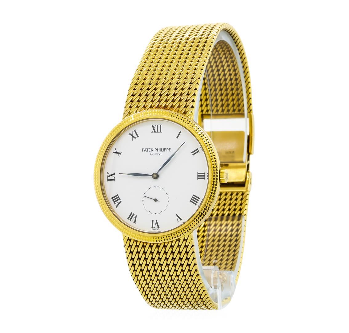 One gents, Patek Philippe Calatrava wristwatch electronically tested 18KT yellow gold, Case: 34mm in diameter, Case Back: Swiss Hallmarked, Crown: scalloped with the Patek Philippe logo in high relief, Bezel: Hobnail pattern detail, bright polish, Crystal: synthetic sapphire. Movement: mechanical, Patek Philippe signed Dial: White color, baton narrow pointed hands, and Roman numerals, Continuous Seconds Sub Dial: 6 o'clock position, Patek Philippe, Bracelet: integrated 18KT yellow gold mesh link, Condition: G-5 Fine. Seven and one half inch length. Patek Philippe & Swiss Hallmarked 18KT Yellow gold clasp, with logo. Total Weight of Watch 89.91gm. AIG Appraised at $30,000.00.