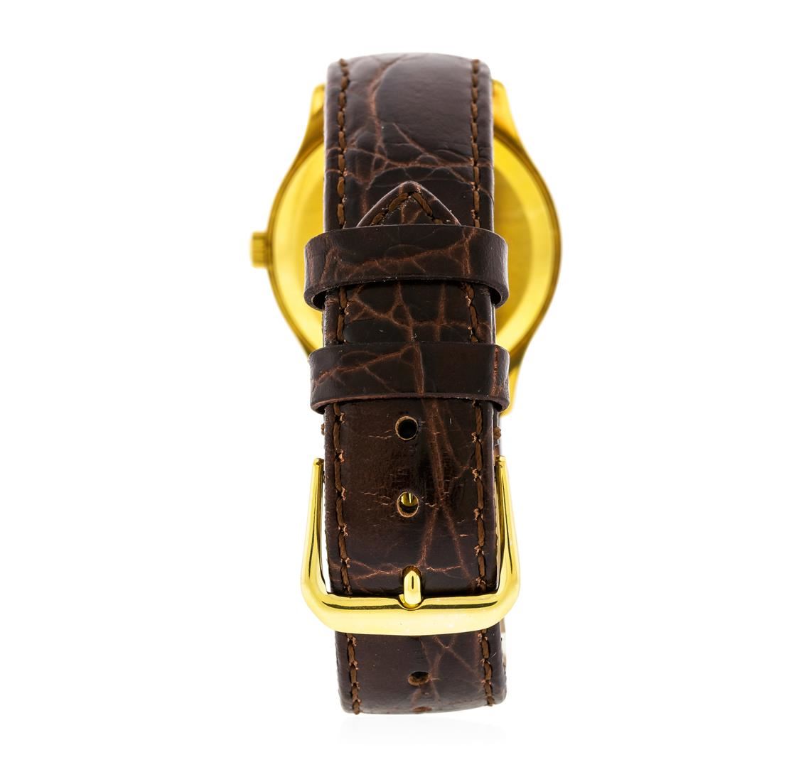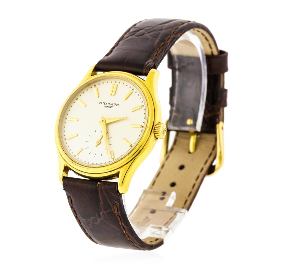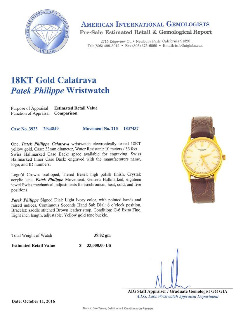 One, Patek Philippe Calatrava wristwatch electronically tested 18KT yellow gold, Case: 33mm diameter, Water Resistant: 10 meters / 33 feet. Swiss Hallmarked Case Back: space available for engraving, Swiss Hallmarked Inner Case Back: engraved with the manufacturers name, logo, and ID numbers. Logo'd Crown: scalloped, Tiered Bezel: high polish finish, Crystal: acrylic lens, Patek Philippe Movement: Geneva Hallmarked, eighteen jewel Swiss mechanical, adjustments for isochronism, heat, cold, and five positions. Patek Philippe Signed Dial: Light Ivory color, with pointed hands and raised indices, Continuous Seconds Hand Sub Dial: 6 o'clock position, Bracelet: saddle stitched Brown leather strap, Condition: G-6 Extra Fine. Eight inch length, adjustable. Yellow gold tone buckle. Total Weight of Watch 39.82gm. AIG Appraised at $33,000.00.
