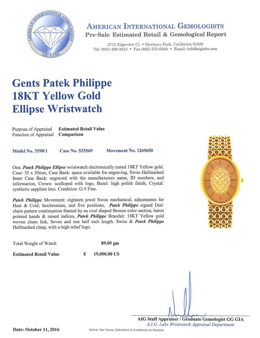 One, Patek Philippe Ellipse wristwatch electronically tested 18KT Yellow gold. Case: 35 x 30mm, Case Back: space available for engraving, Swiss Hallmarked Inner Case Back: engraved with the manufacturers name, ID numbers, and information, Crown: scalloped with logo, Bezel: high polish finish, Crystal: synthetic sapphire lens. Condition: G-5 Fine. Patek Philippe Movement: eighteen jewel Swiss mechanical, adjustments for Heat & Cold, Isochronism, and five positions, Patek Philippe signed Dial: chain pattern continuation framed by an oval shaped Bronze color section, baton pointed hands & raised indices, Patek Philippe Bracelet: 18KT Yellow gold woven chain link, Seven and one half inch length. Swiss & Patek Philippe Hallmarked clasp, with a high relief logo. Total Weight of Watch 89.09gm. AIG Appraised at $19,000.00.