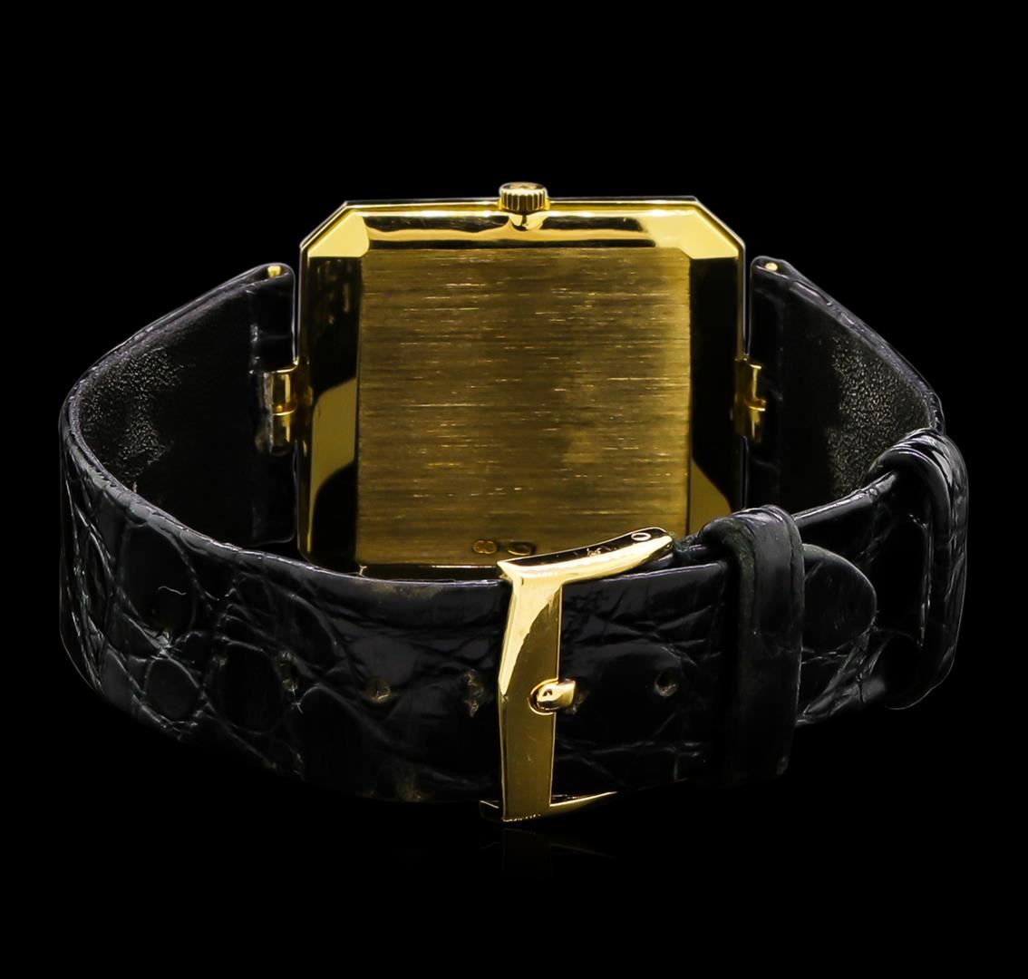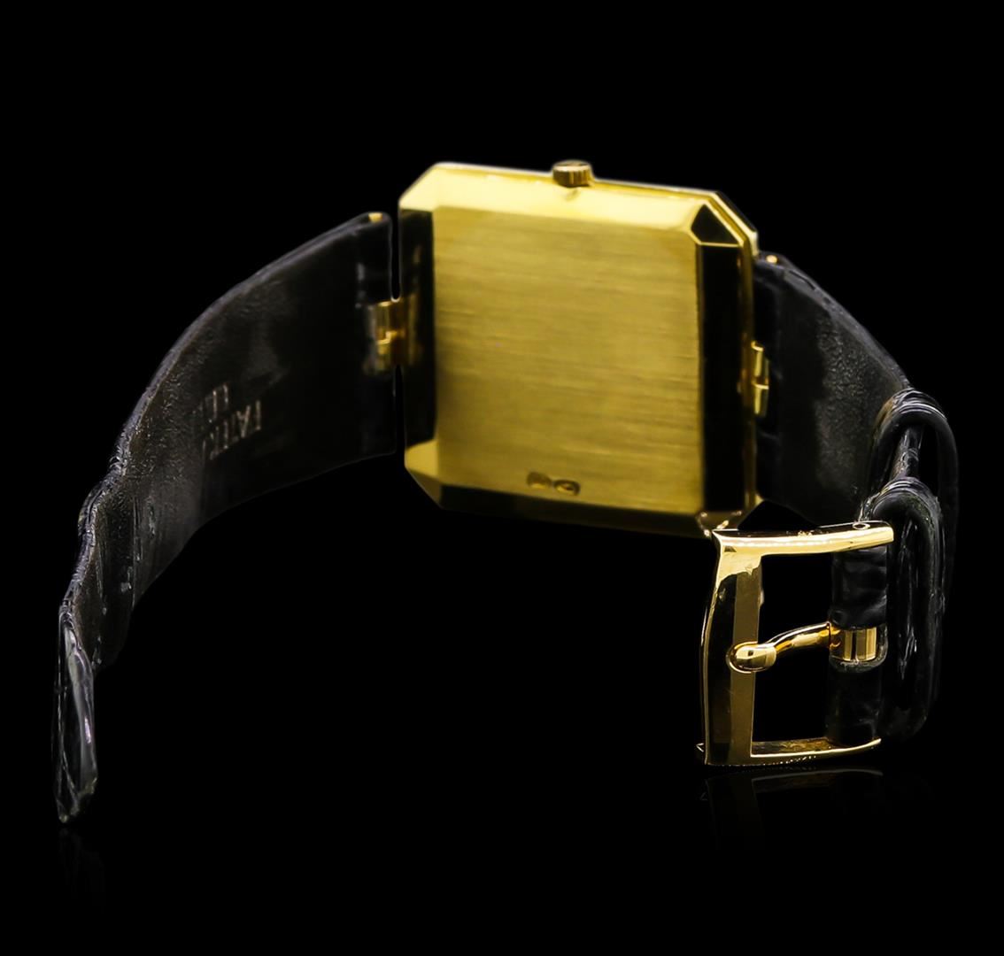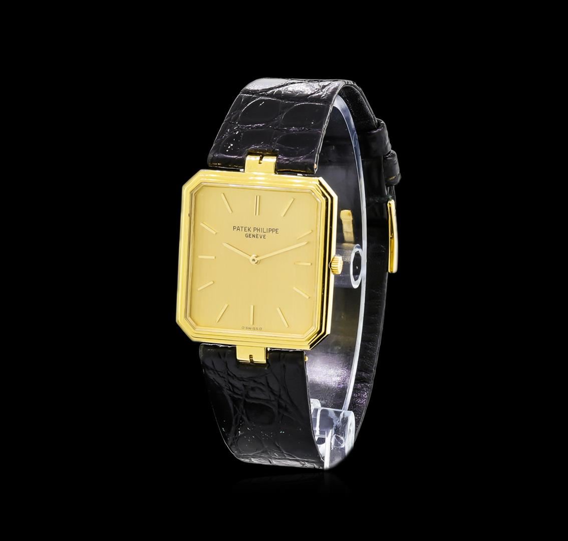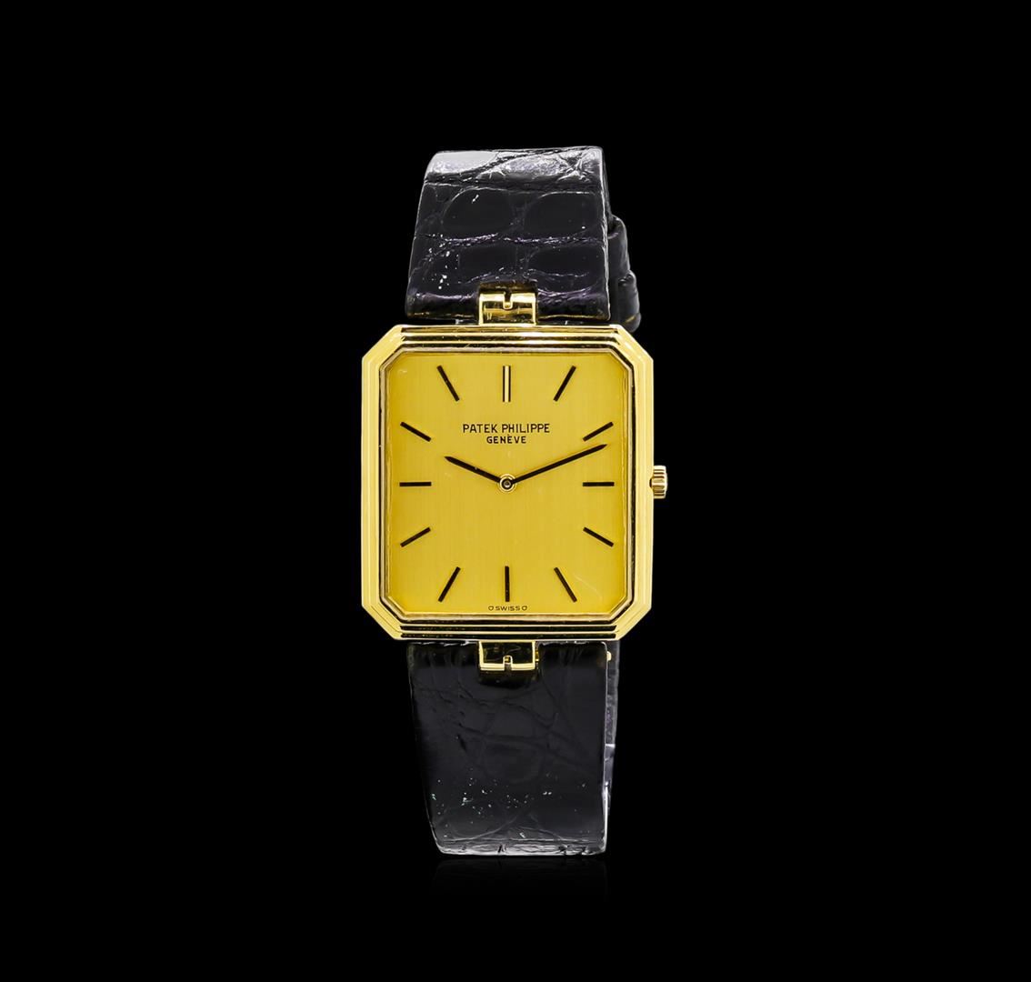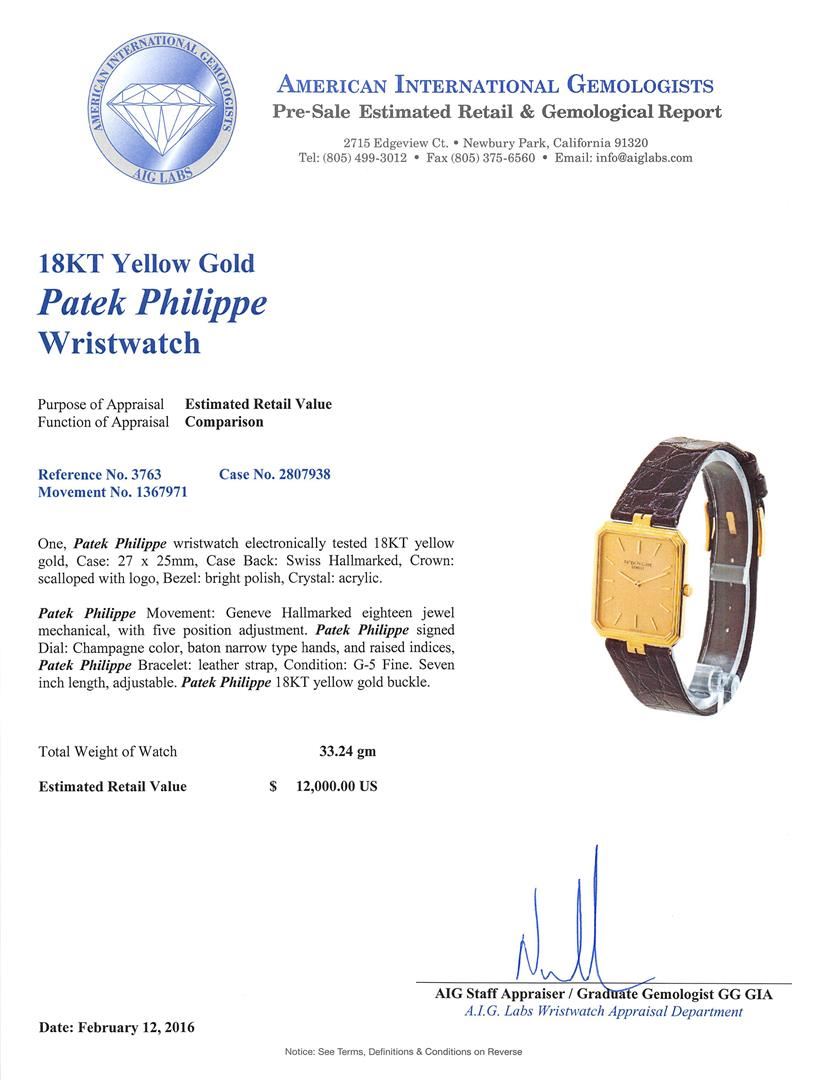 One, Patek Philippe wristwatch electronically tested 18KT yellow gold, Case: 27 x 25mm, Case Back: Swiss Hallmarked, Crown: scalloped with logo, Bezel: bright polish, Crystal: acrylic. Patek Philippe Movement: Geneve Hallmarked eighteen jewel mechanical, with five position adjustment. Patek Philippe signed Dial: Champagne color, baton narrow type hands, and raised indices, Patek Philippe Bracelet: leather strap, Condition: G-5 Fine. Seven inch length, adjustable. Patek Philippe 18KT yellow gold buckle. Total Weight of Watch 33.24gm. AIG Appraised at $12,000.00.