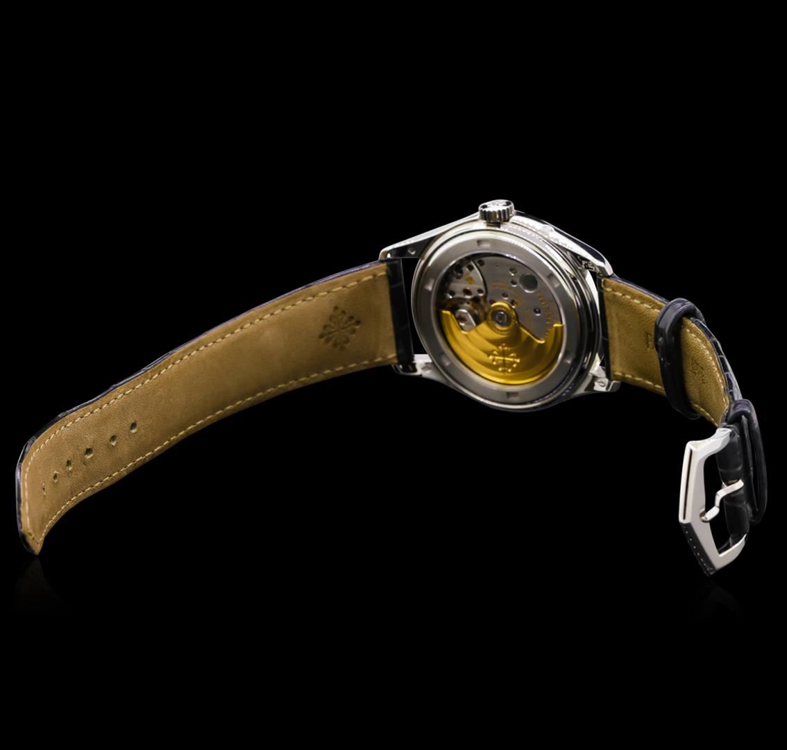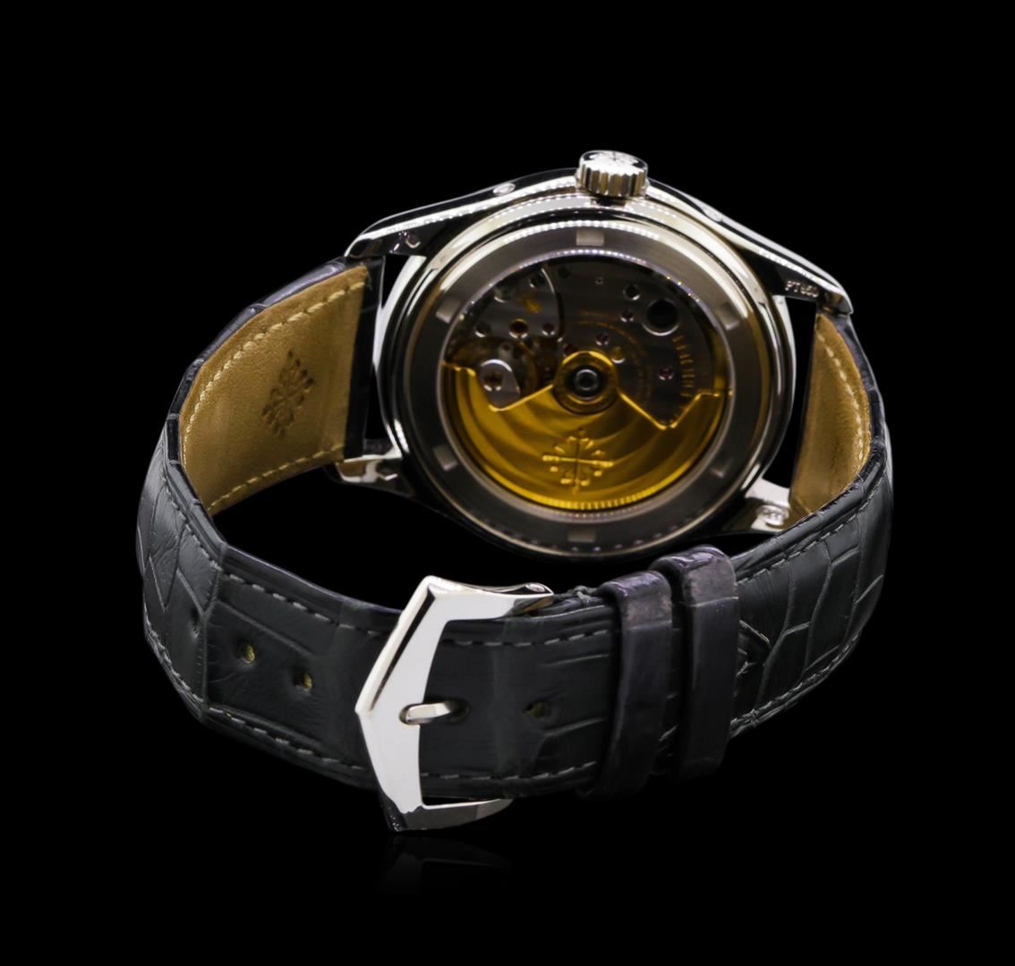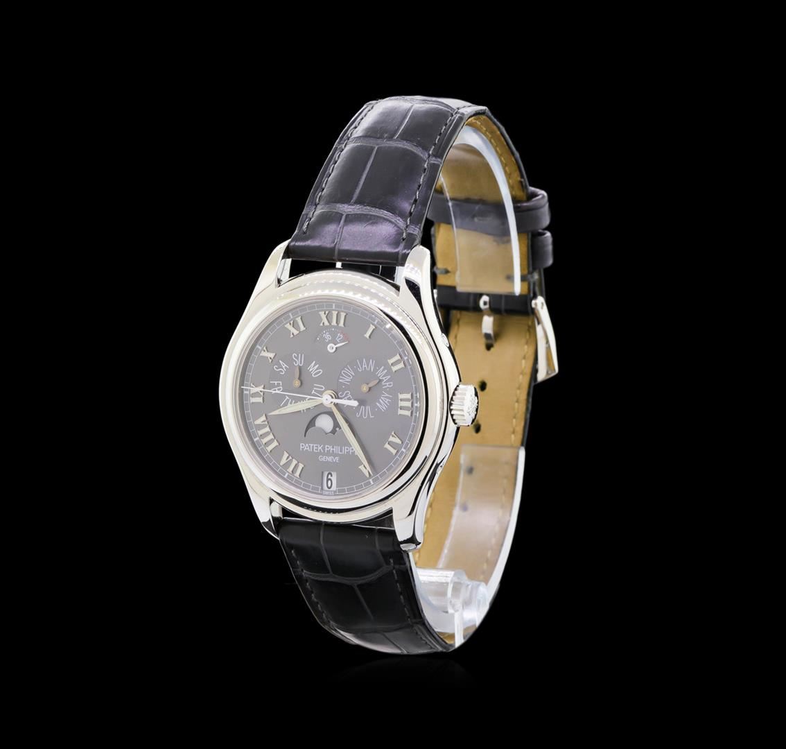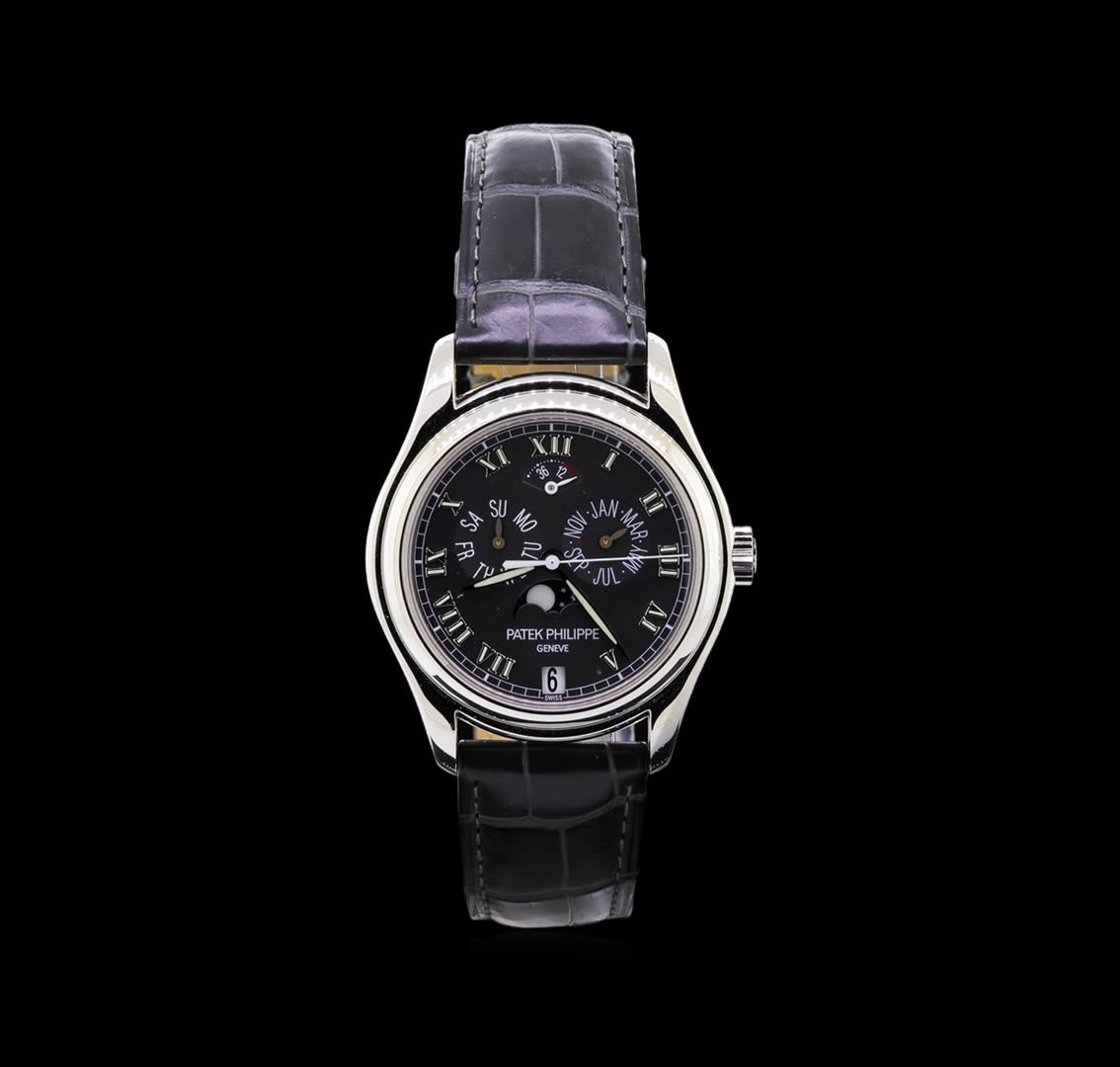 One Patek Philippe Annual Calendar watch featuring: Case: round, 37mm, platinum. Dial: brushed grey with Roman numerals and date window at 6 o'clock. Movement: Automatic. Crystal: Sapphire. Bracelet: Black leather with platinum buckle. Features annual calendar and moonphase indicator. Condition: Very minimal signs of wear, overall excellent condition.