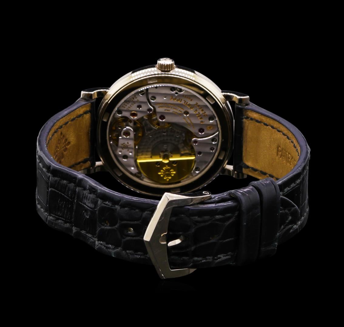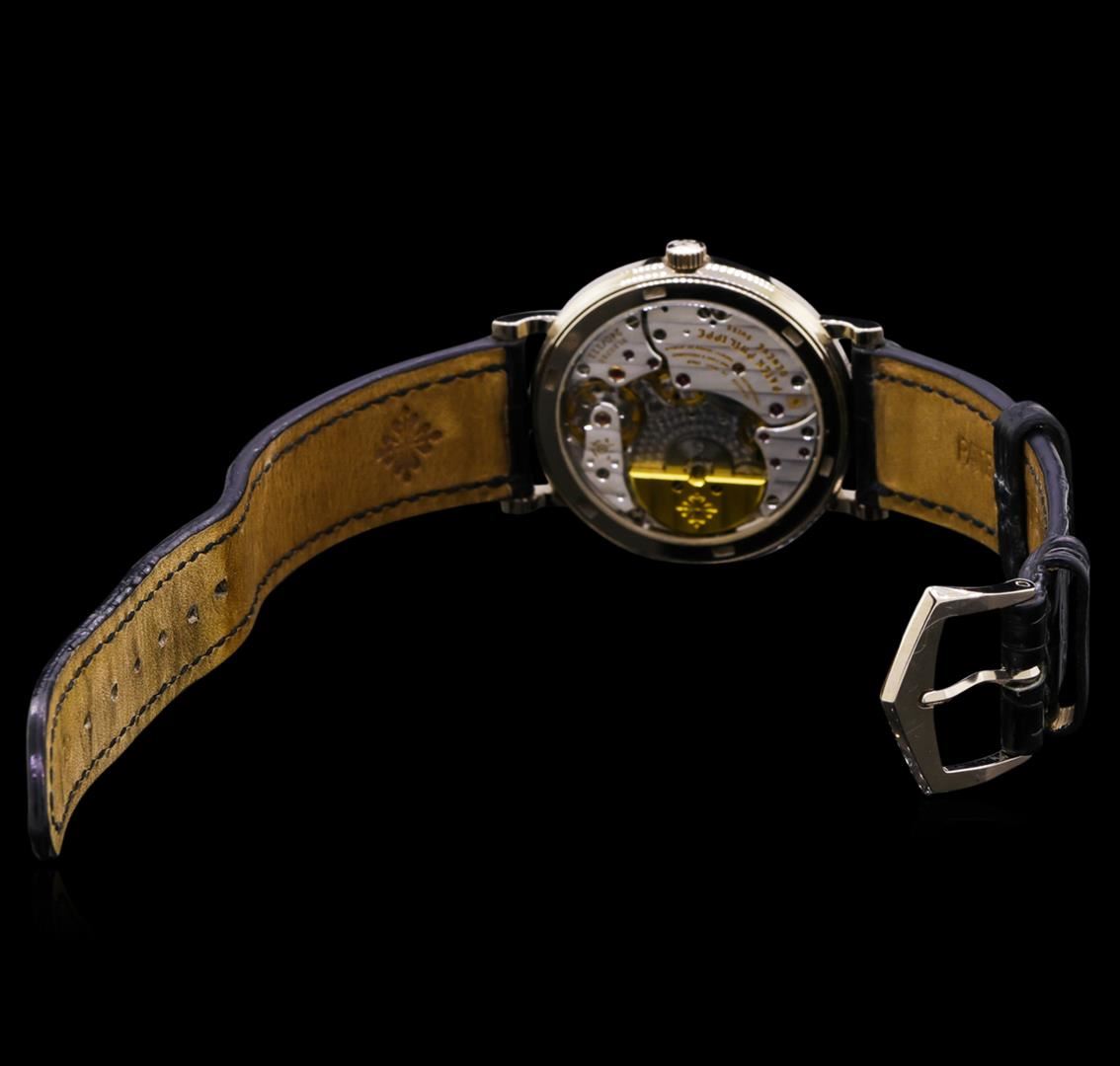 One Patek Philippe Calatrava watch featuring: Case: 18KT white gold, 35mm round. Dial: White with Roman numerals, pointed baton-type hands. Movement: Automatic. Bracelet: black leather. Crystal: Sapphire. Condition: very light wear on case and bracelet, overall near perfect condition.