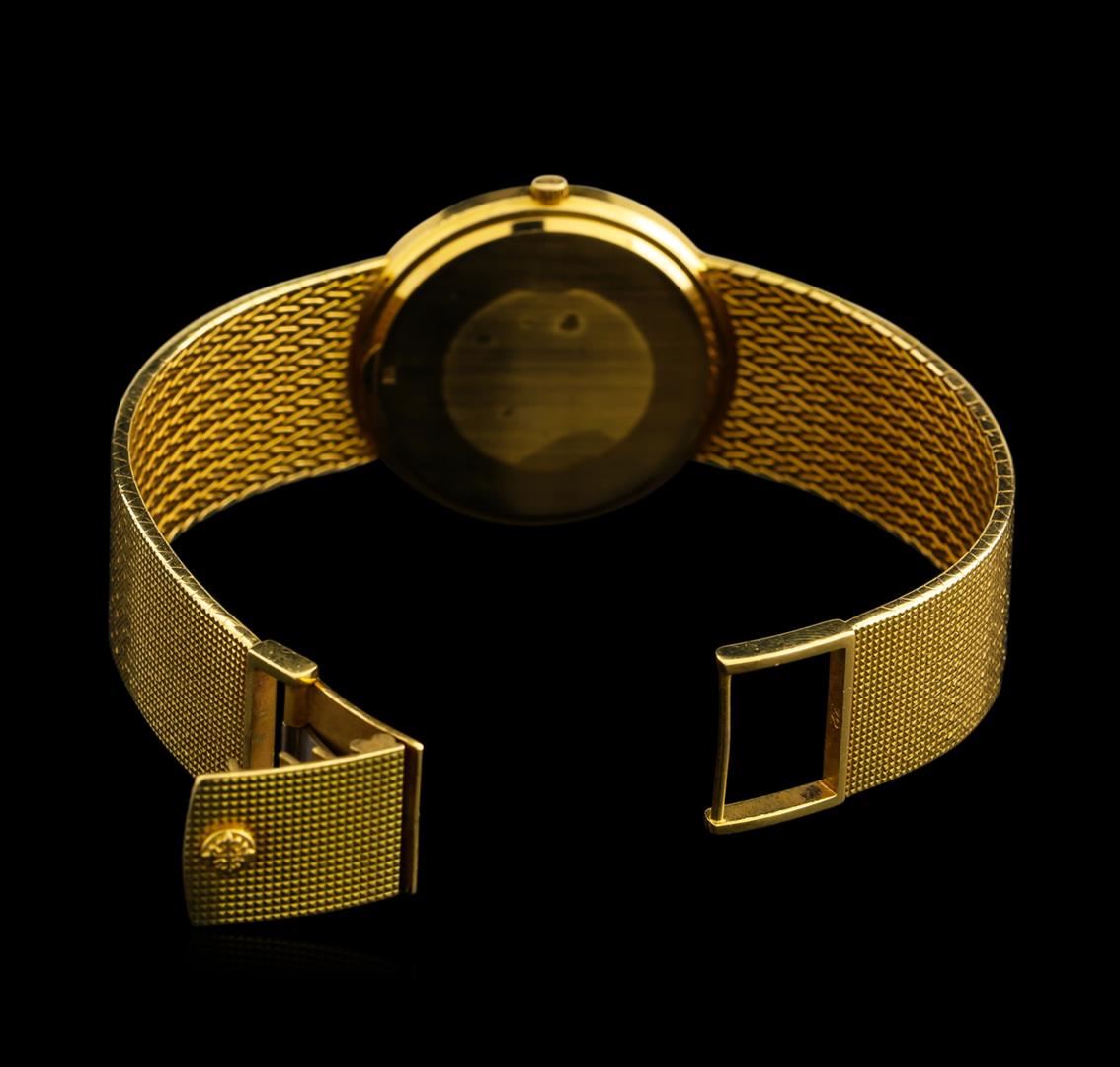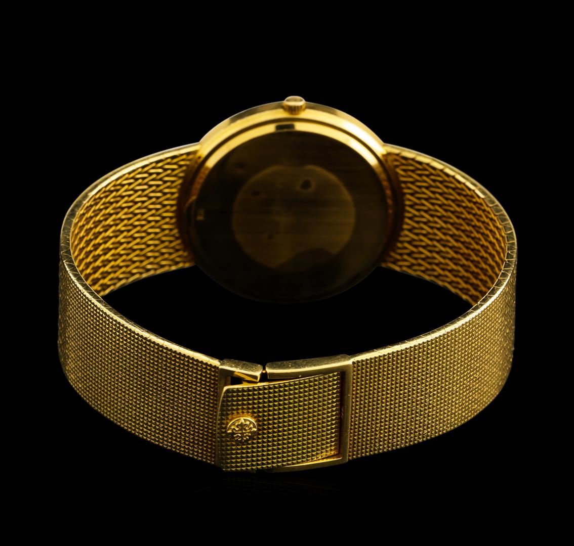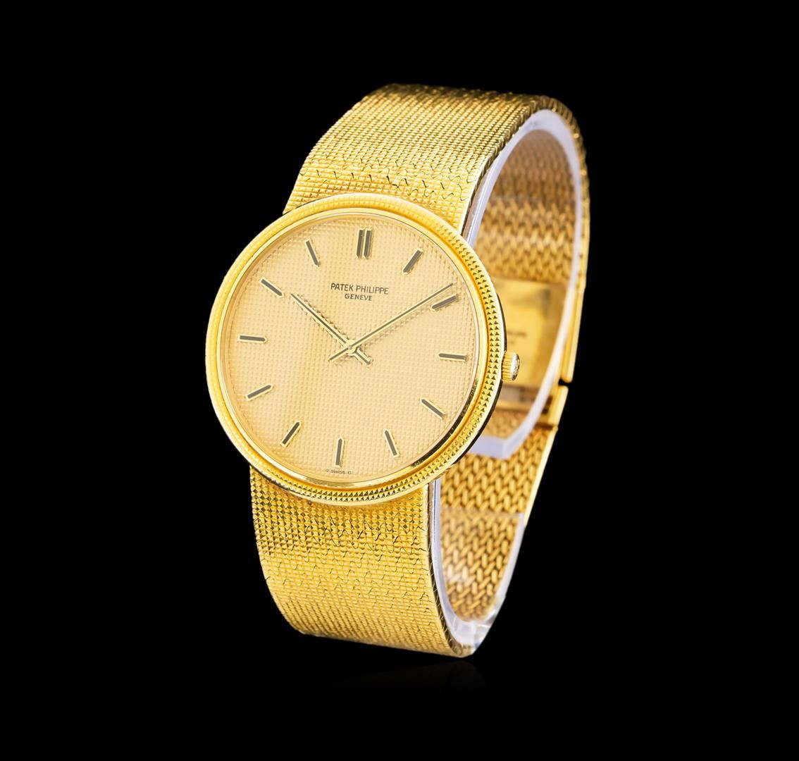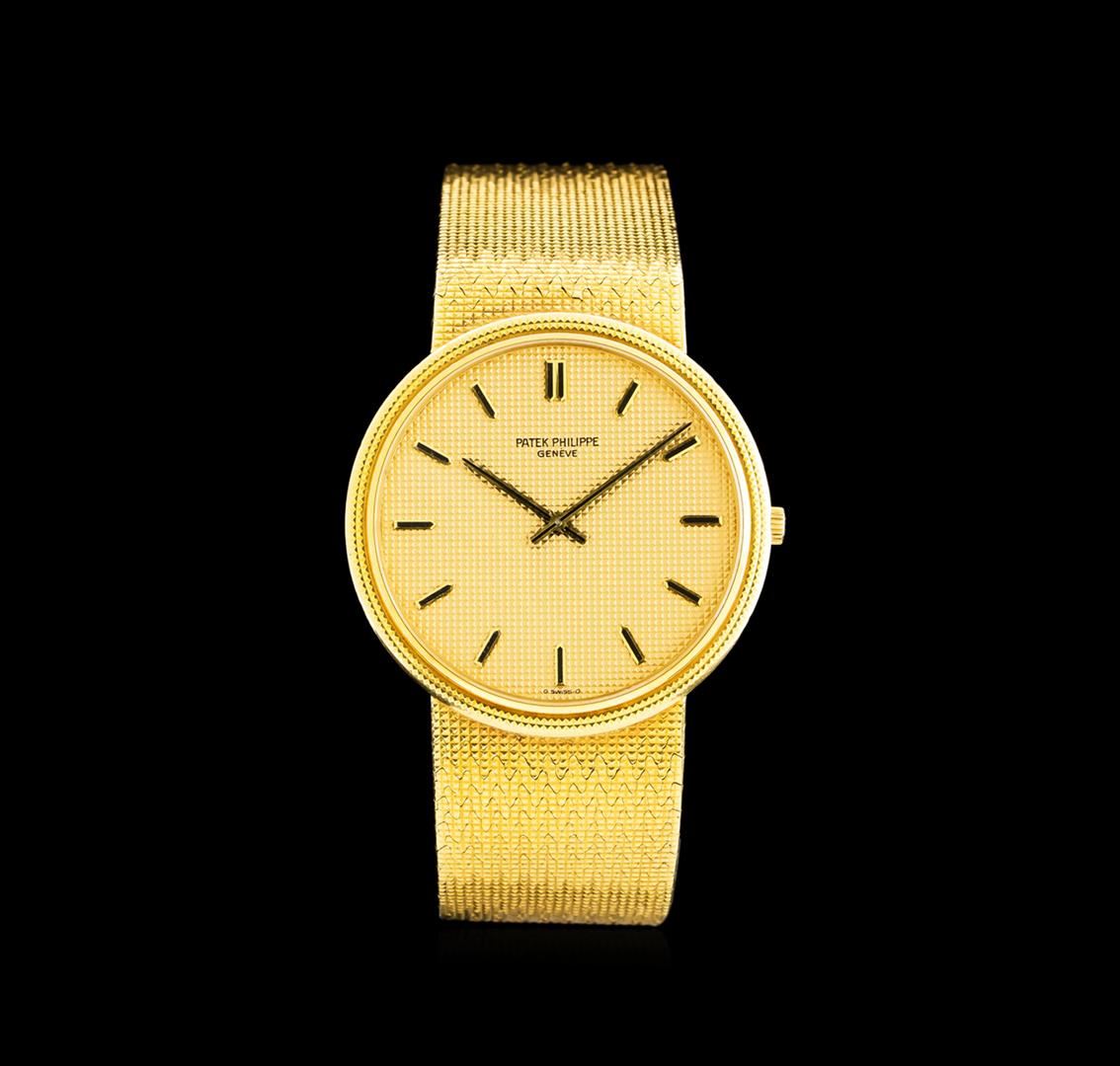 One Patek Philippe Calatrava men's watch featuring: Case: 18KT yellow gold. Case Shape: Approx. 35mm round. Dial: Champagne texture with gold hour markers and pointed baton type hands. Bracelet: Gold.