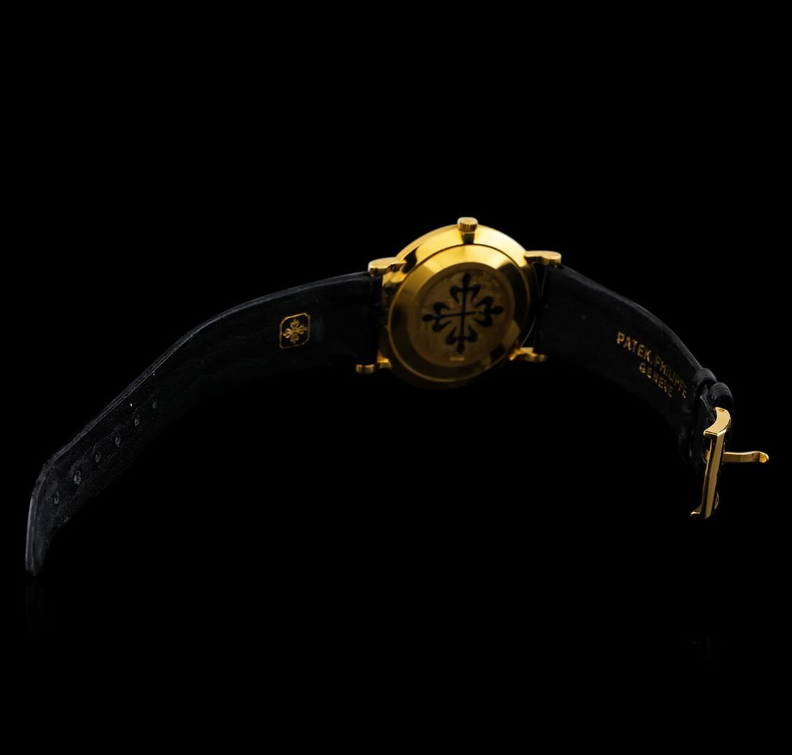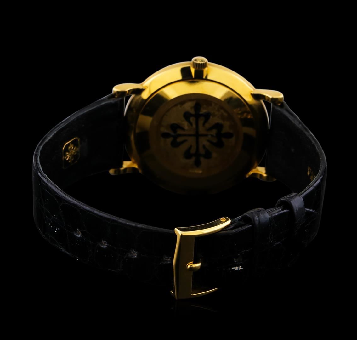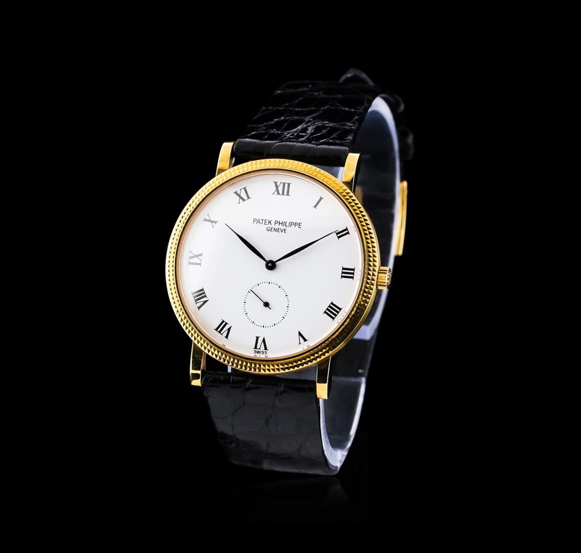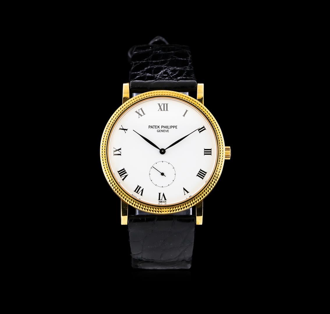 One Patek Philippe Calatrava watch featuring: Case: 18KT yellow gold, 33mm round. Dial: White with roman numerals, pointed baton-type hands. Movement: Manual wind. Bracelet: black leather. Crystal: Sapphire. Condition: Minor wear on bracelet and back of case but otherwise in excellent condition.