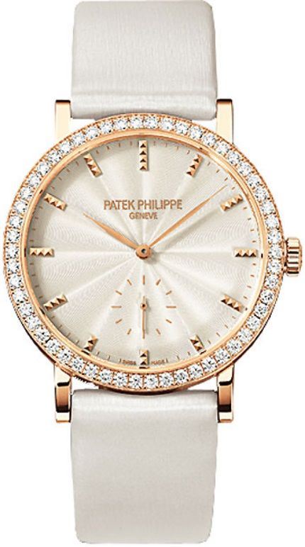 Model: 7120R-001 - CASE = [Material:18kt Rose Gold], [Case Diameter:31], [Bezel:18K Rose Gold and Diamonds], [Case Back:Transparent], [Water Resistant:30 Meters - 100 Feet], [Crystal:Scratch Resistant Sapphire], DIAL = [Color:Beige And Diamonds], MOVEMENT = [Type:Manual Winding Mechanical], [Crown:Push In], BAND = [Clasp:Deployment], [Type:White Satin], (Usually ships in 1 to 2 weeks.)