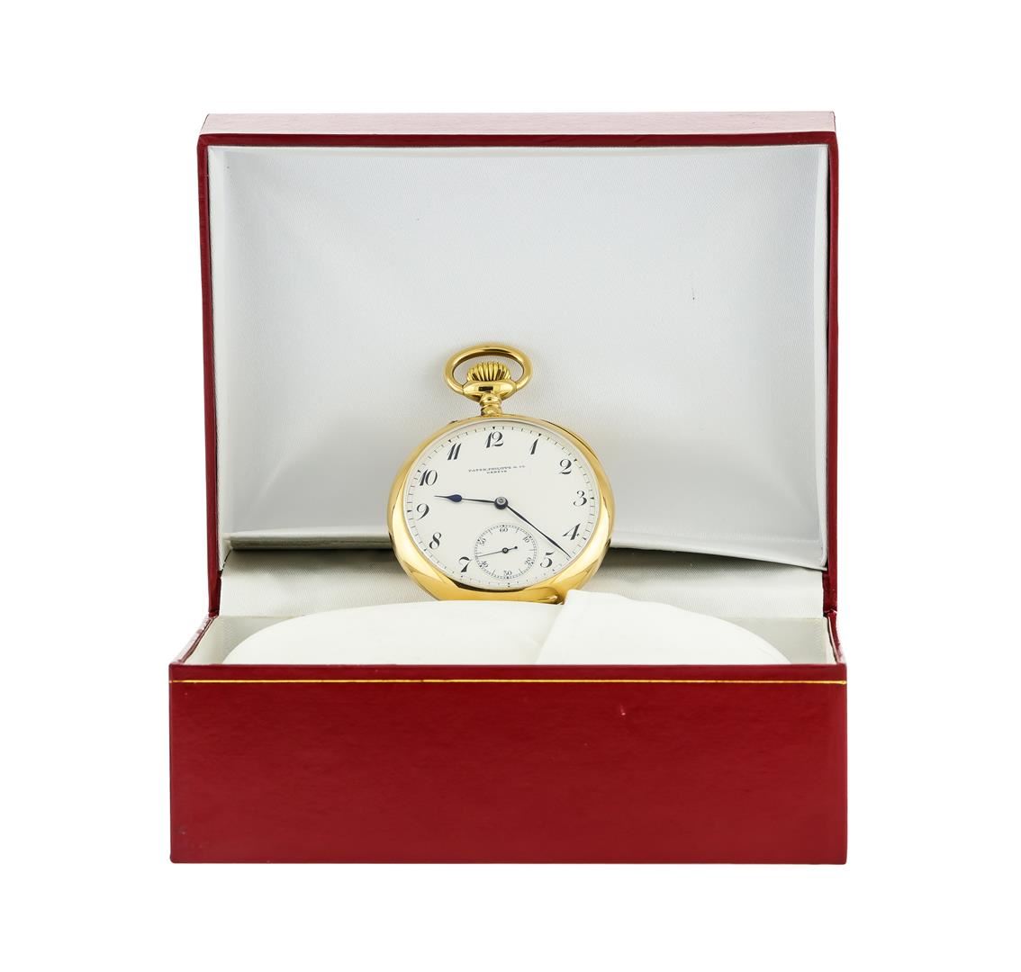 One Patek Philippe & Co. open face pocketwatch electronically tested 18KT yellow gold, Case: 48mm diameter, Obverse Case Cover: polished, engraved with an elaborate initials pattern, Movement Case Cover: the central area is available for engraving, the outer edge is engraved with the manufacturers name, city, and ID numbers, Circa: 1910. Movement: 42mm diameter, mechanical stem wind with one adjustment, signed Patek Philippe & cie, Geneve, Dial: White color, with Blue Steel hands, Black numerals, and a Black minute division track, signed Patek Philippe & Cie Geneve, Subsidiary Seconds Sub Dial: at the 6 o'clock position, Condition: G-5 Fine. Total Weight of Watch: 87.05gm. Comes with box.