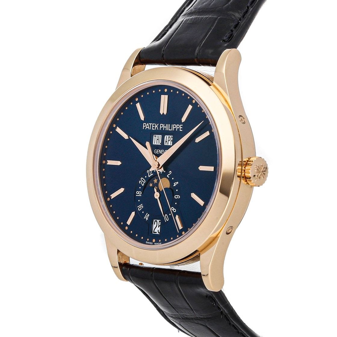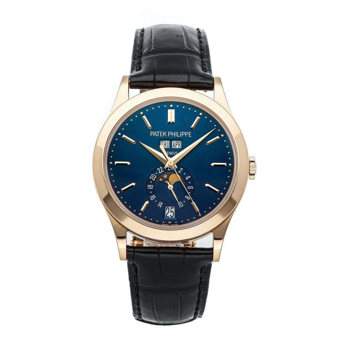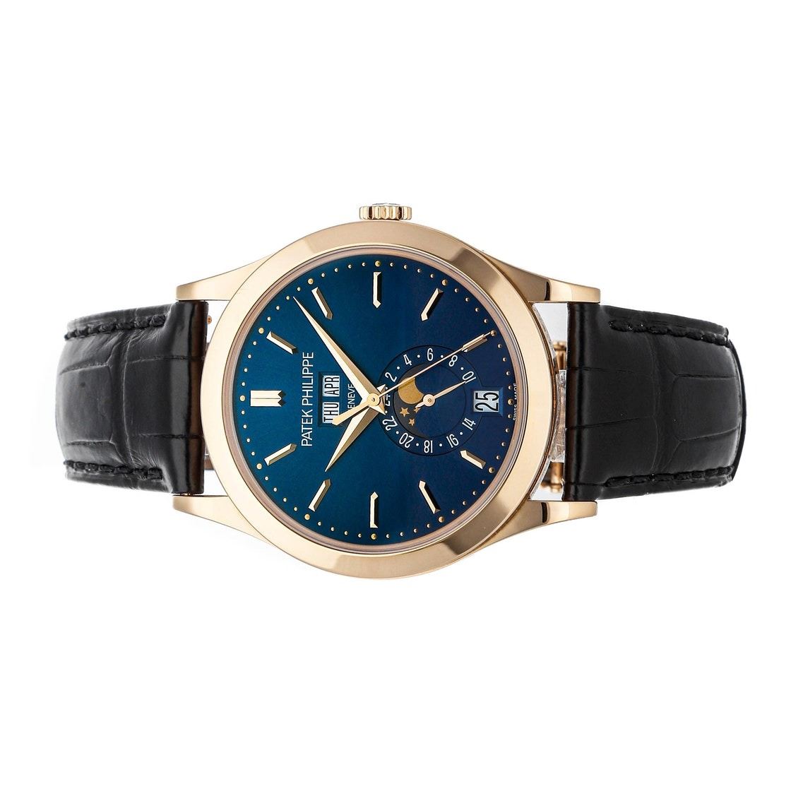 Pre-Owned Patek Philippe Complications Annual Calendar Moon Phases (5396R014) self-winding automatic watch, features a 38.5mm 18k rose gold case surrounding a blue sunburst dial on a black alligator strap with an 18k rose gold Calatrava Cross deployant buckle.