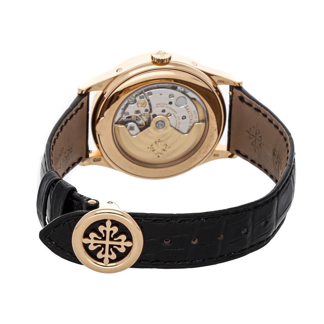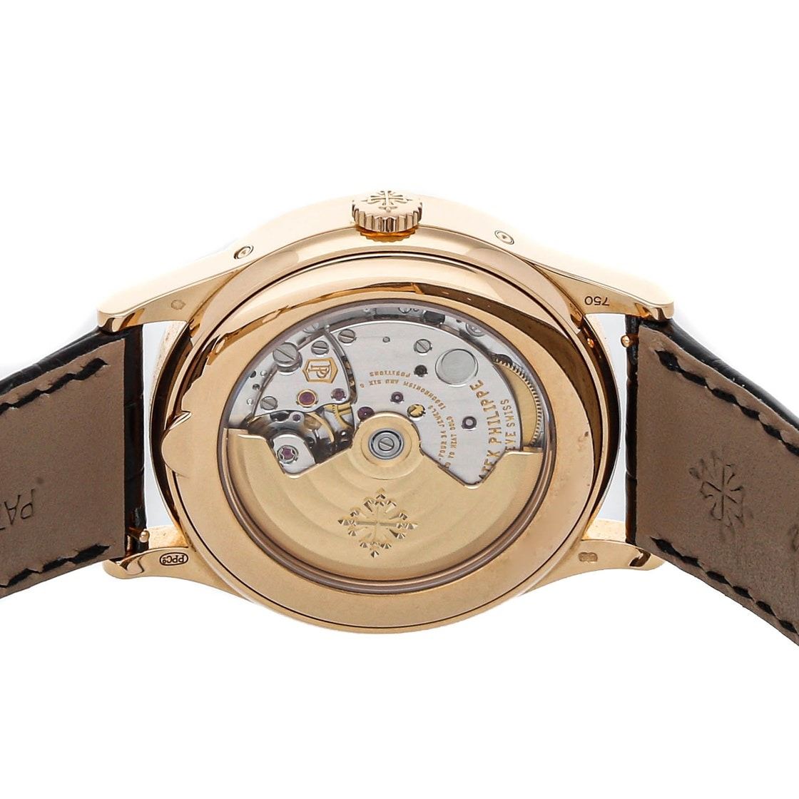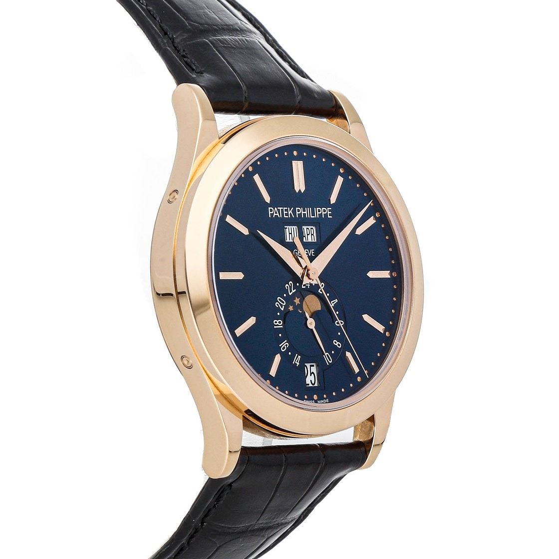 Pre-Owned Patek Philippe Complications Annual Calendar Moon Phases (5396R014) self-winding automatic watch, features a 38.5mm 18k rose gold case surrounding a blue sunburst dial on a black alligator strap with an 18k rose gold Calatrava Cross deployant buckle.