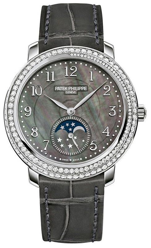 Model: 4968G-001 - Case,; MATERIAL18K WHITE GOLD = [Case Diameter33.3], [BezelDiamonds on Bezel], [Case BackSee-thru Sapphire Crystal], [Water Resistant30 Meters/ 100 Feet], [CrystalScratch Resistant Sapphire Crystal], Dial,; COLORBLACK MOTHER OF PEARL = Movement,; TYPEMANUAL WINDING WITH APPROXIMATELY 44 HOUR POWER RESERVE = Band,; CLASPTANG = [TypeGrey Crocodile Leather], (Usually ships in 1 to 2 business days.)