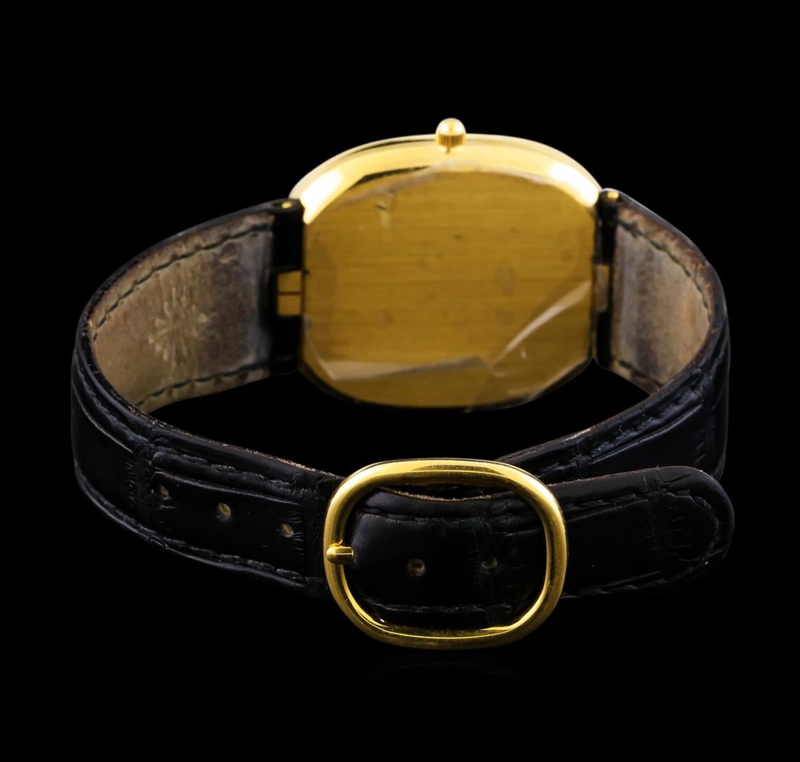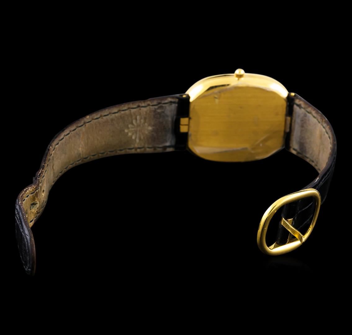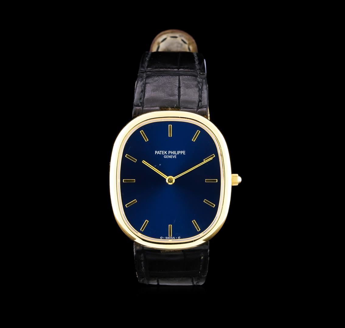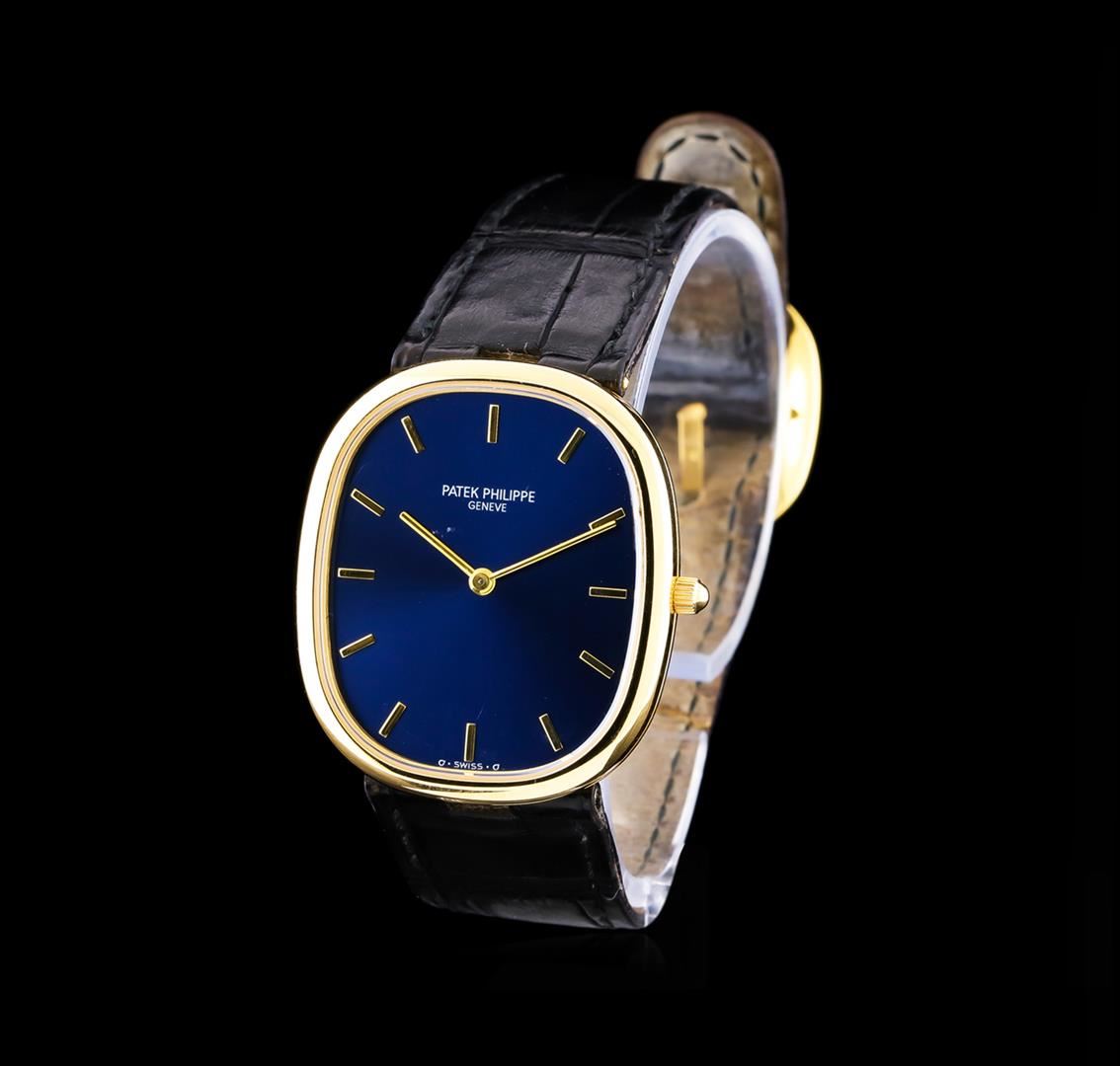 One Patek Philippe Golden Ellipse watch featuring: Case: 18KT yellow gold, 36mm x 31mm rounded rectangle. Dial: Blue with hour markers, yellow gold hands. Movement: Automatic. Bracelet: black leather with 18KT yellow gold buckle. Crystal: Sapphire. Condition: Minor scratches on case and light wear on bracelet, but otherwise in great condition.