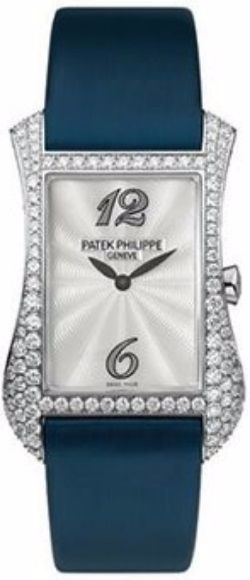 Model: 4972G-001 - CASE = [Material:White Gold, set with 130 diamonds], [Bezel:18kt White Gold and Diamonds], [Case Back:Solid], [Water Resistant:60 Meters - 200 Feet], [Crystal:Scratch Resistant Sapphire],; DIAL = [Color:Silver],; MOVEMENT = [Type:Battery Powered Quartz], [Crown:Push In],; BAND = [Clasp:Deployment], [Type:Blue Satin], (Usually ships in 1 to 2 weeks.)