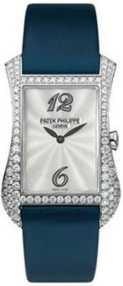 Model: 4972G-001 - CASE = [Material:White Gold, set with 130 diamonds], [Bezel:18kt White Gold and Diamonds], [Case Back:Solid], [Water Resistant:60 Meters - 200 Feet], [Crystal:Scratch Resistant Sapphire], DIAL = [Color:Silver], MOVEMENT = [Type:Battery Powered Quartz], [Crown:Push In], BAND = [Clasp:Deployment], [Type:Blue Satin], (Usually ships in 1 to 2 weeks.)