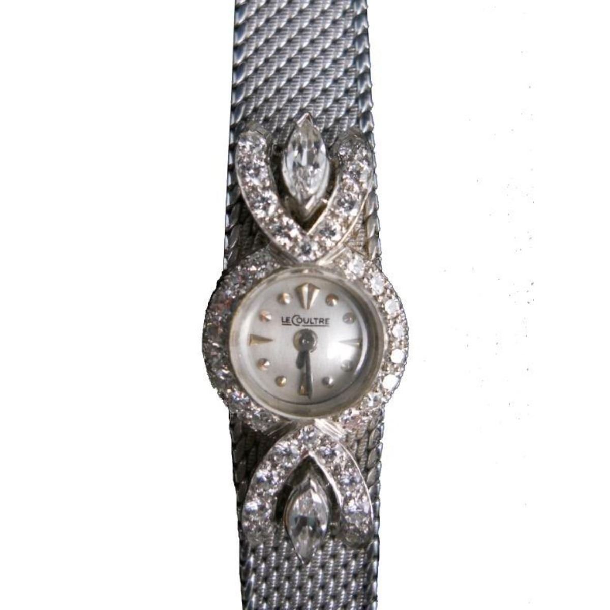 Patek Philippe ladies platinum & diamond watch. Band accented with 2 marquise-cut diamonds, total estimated weight .40 cts. & 34 round & full-cut diamonds, total estimated weight .54 cts., color H, clarity VS, watchface and winding stem marked in Le Coultrein, 18 kt. white gold mesh band with marks for Patek Philippe, 28 grams gross weight, 6 in. band