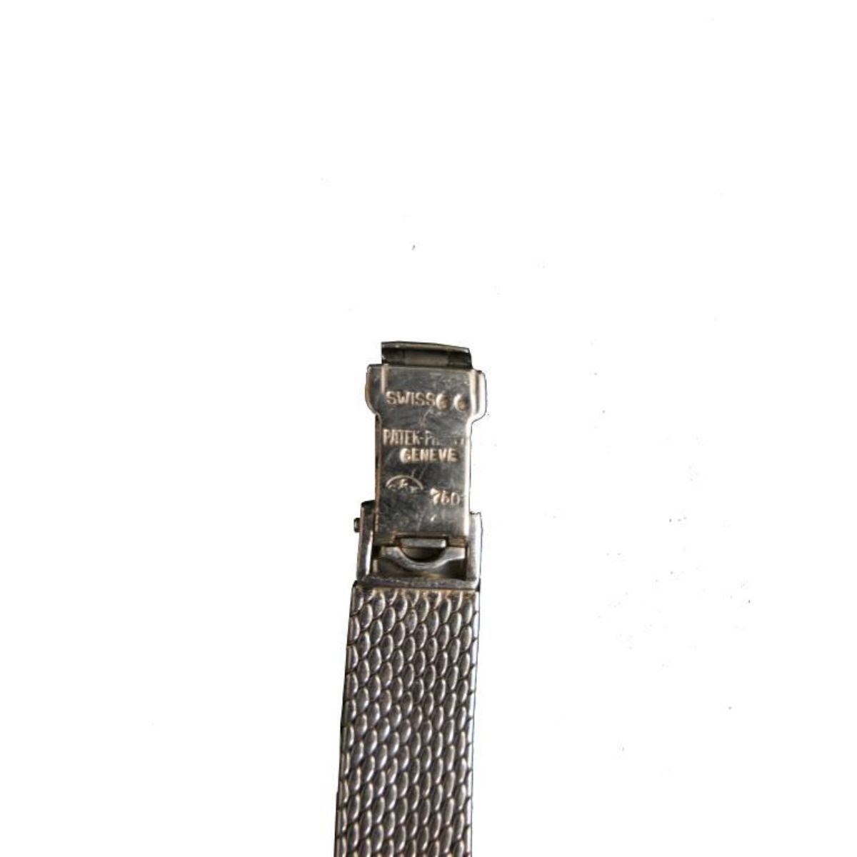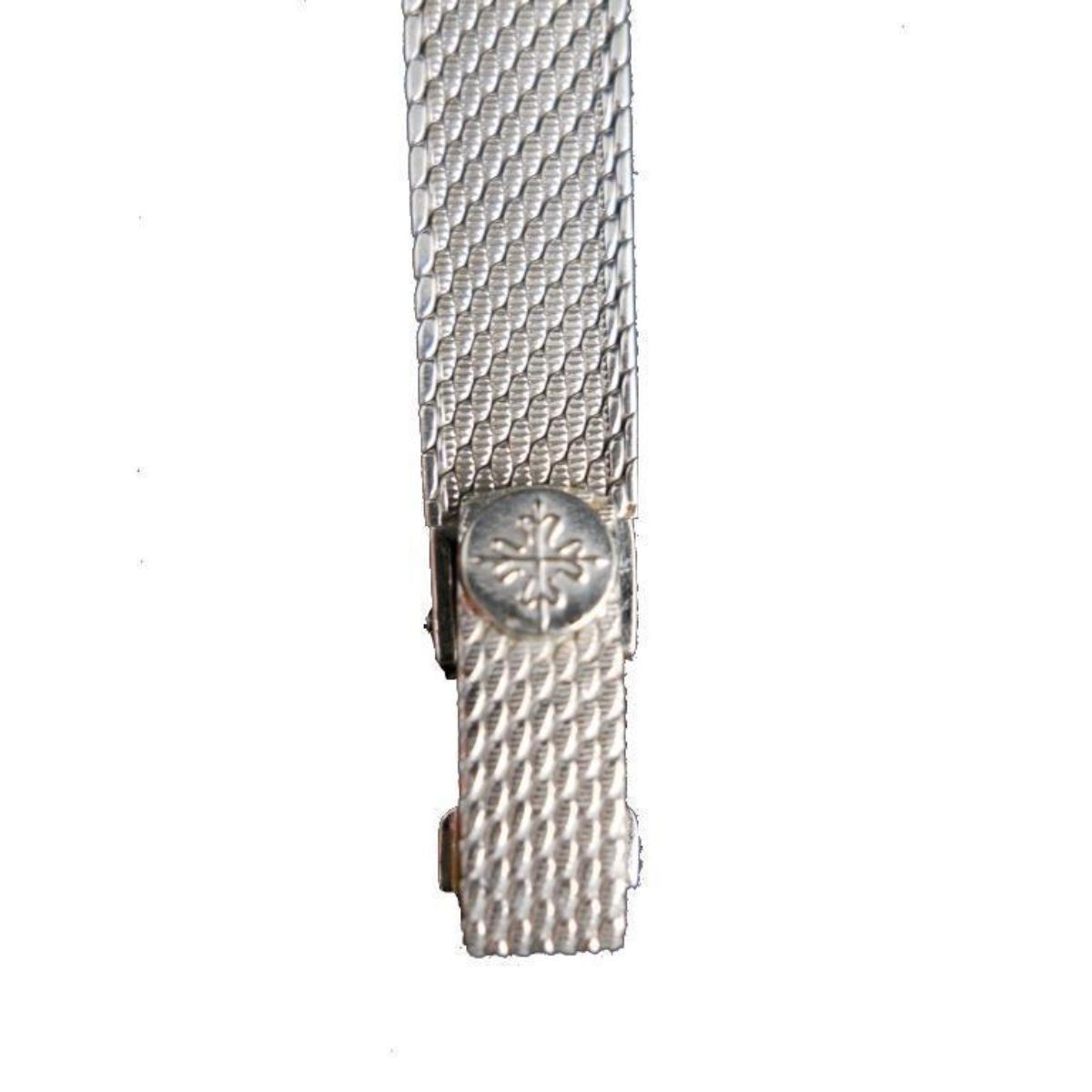 Patek Philippe ladies platinum & diamond watch. Band accented with 2 marquise-cut diamonds, total estimated weight .40 cts. & 34 round & full-cut diamonds, total estimated weight .54 cts., color H, clarity VS, watchface and winding stem marked in Le Coultrein, 18 kt. white gold mesh band with marks for Patek Philippe, 28 grams gross weight, 6 in. band