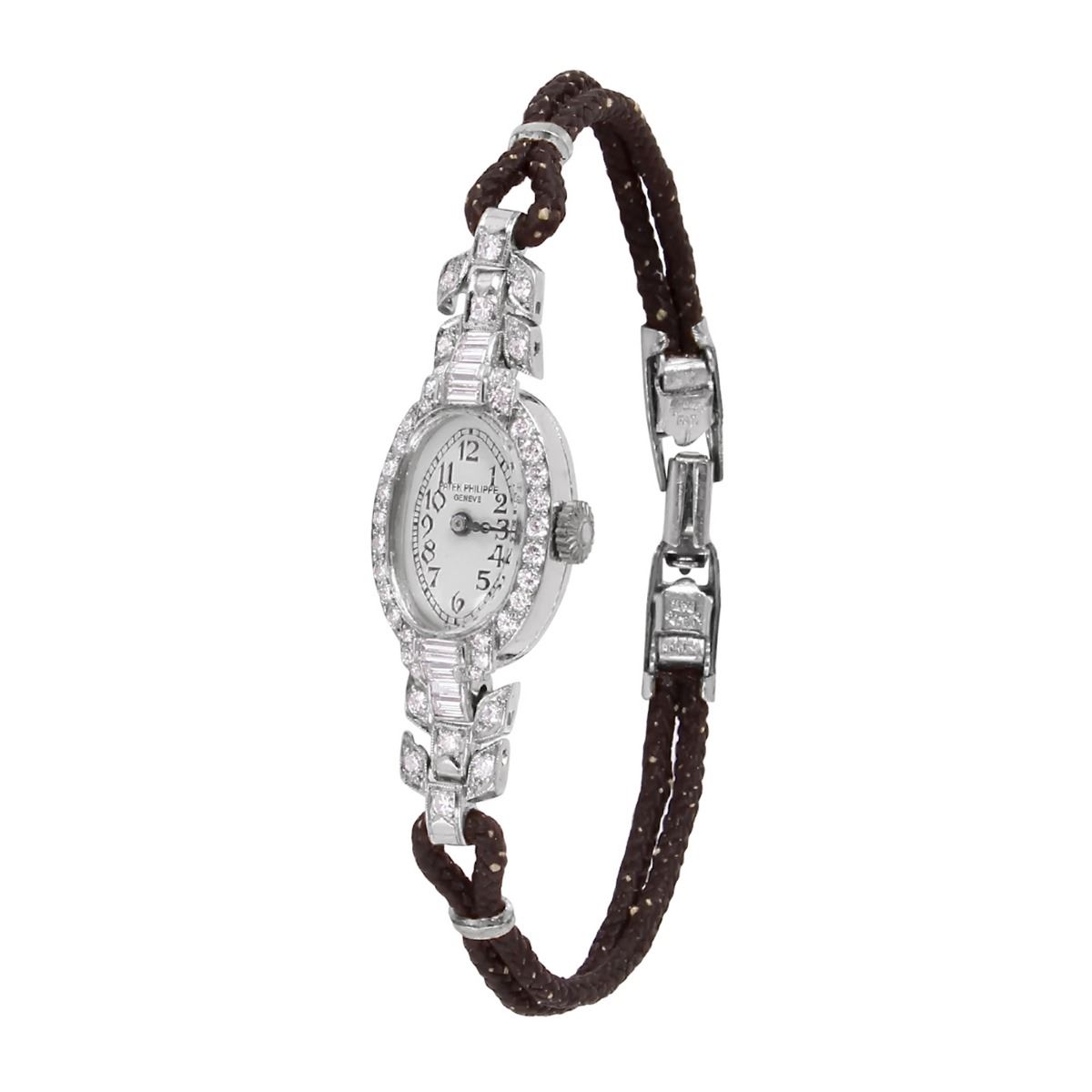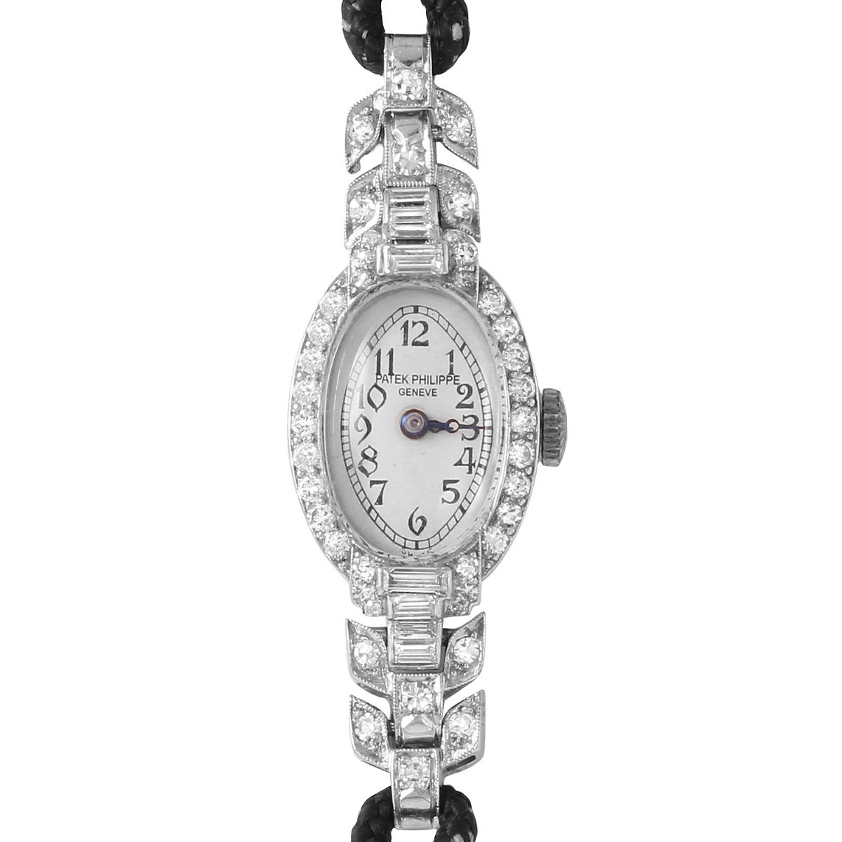 Ladies vintage genuine authentic designer Patek Philippe Platinum and Diamonds watch, circa 1930's up for grabs! Sparkling with channel set baguette and round diamonds along the face. Carefully set on a double rope bracelet that closes gracefully with a fold over safety clasp. The descriptions listed should not be construed as an appraisal. The detail is provided as a guideline for color, clarity, weights and measurements to the best of our ability. We welcome inspections. WE SHIP WORLDWIDE!