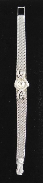 Patek Philippe Ladies Platinum and Diamond Watch. Band accented with 2 marquise-cut diamonds, total estimated weight .40 cts. and 34 round and full-cut diamonds, total estimated weight .54 cts., color H, clarity VS, watch face and winding stem marked in LeCoultrein, 18 kt. white gold mesh band with marks for Patek Philippe, 28 grams gross weight, 6 in. band