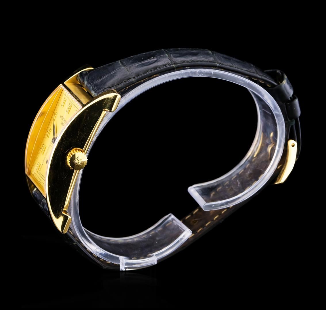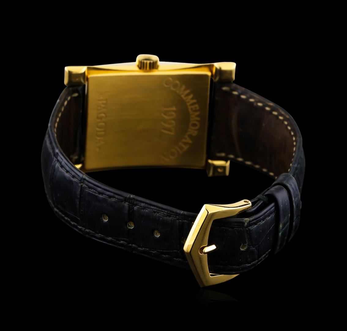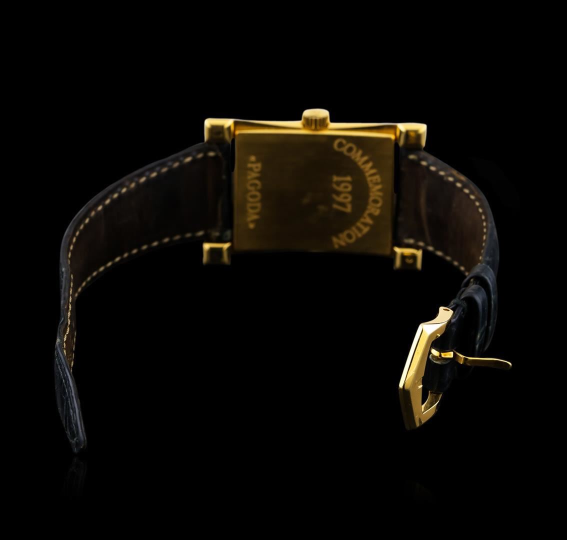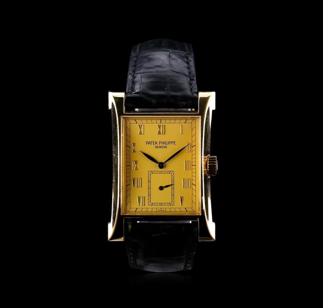 One Patek Philippe Pagoda watch featuring: Case: 18KT yellow gold, 41mm x 29mm. Dial: Gold colored with Roman numerals, yellow gold hands and small seconds at 6 o'clock. Movement: Manual wind. Bracelet: black leather with 18KT yellow gold buckle. Crystal: Sapphire. Condition: Minor scratches on case and light wear on bracelet, but otherwise in great condition.