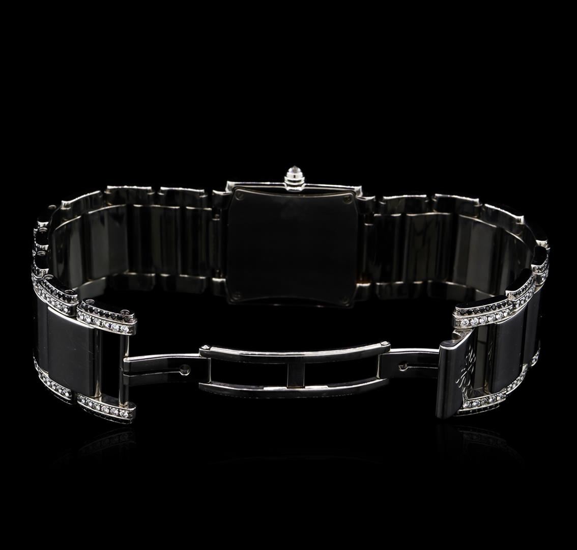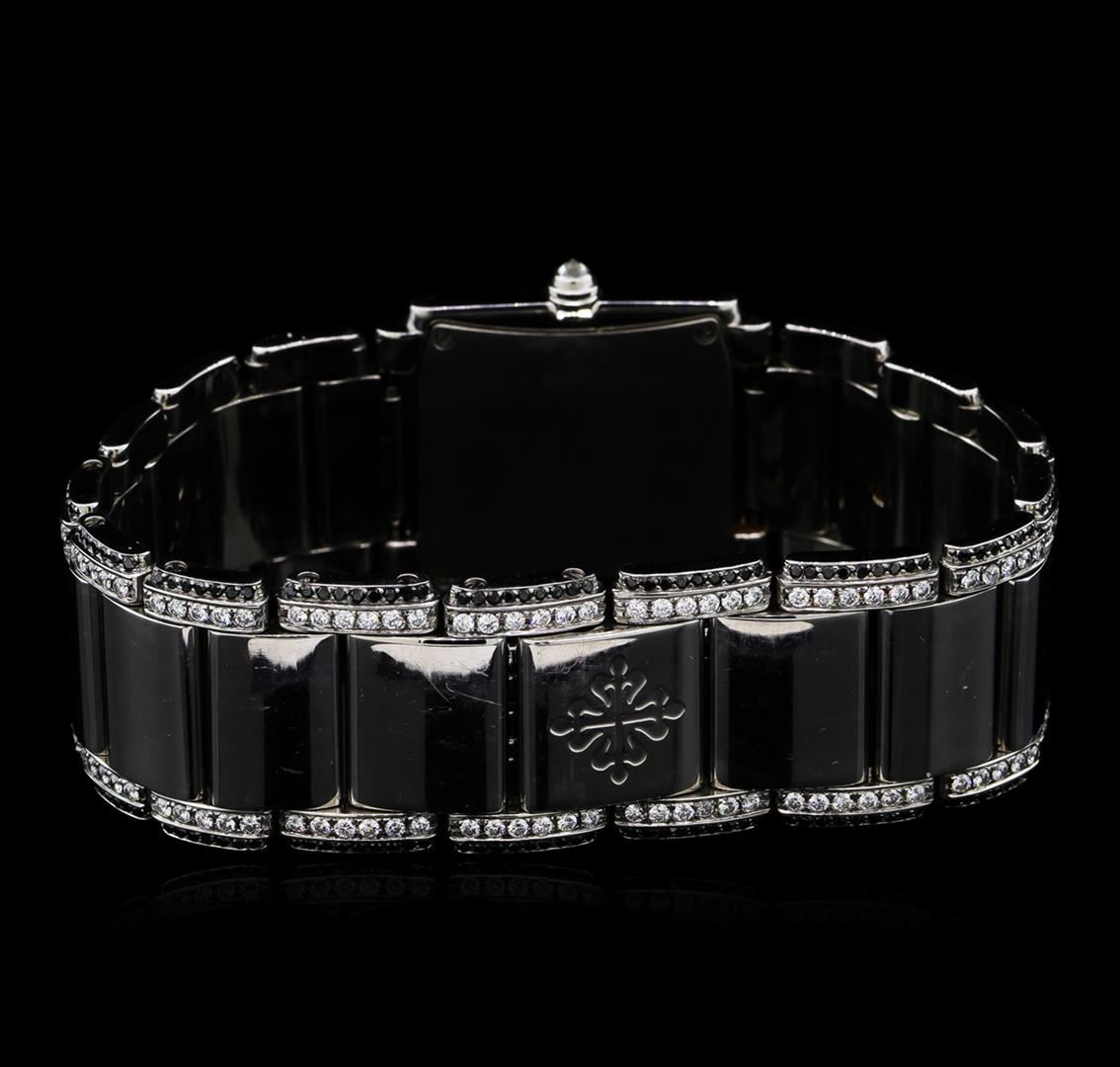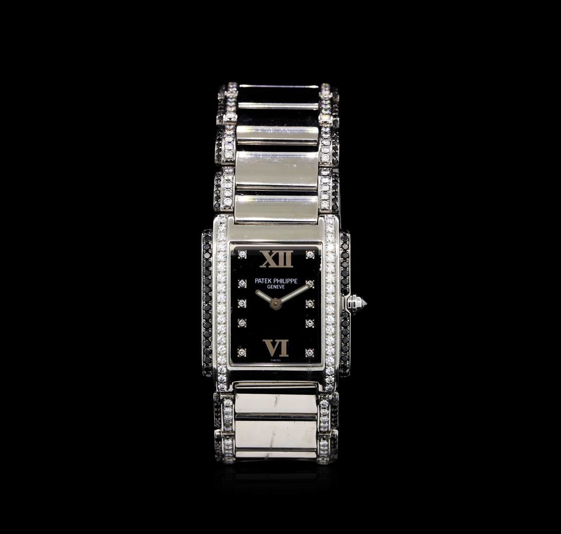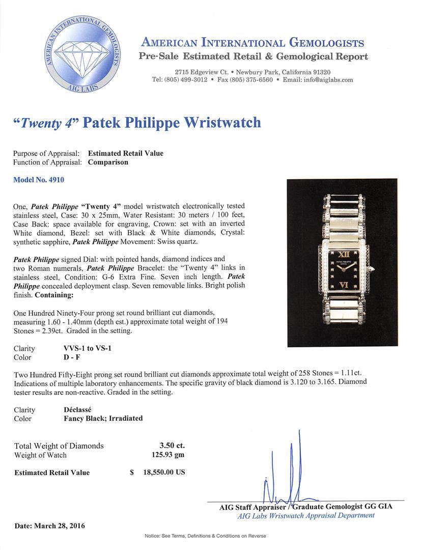 One, Patek Philippe "Twenty 4" model wristwatch electronically tested stainless steel, Case: 30 x 25mm, Water Resistant: 30 meters / 100 feet, Case Back: space available for engraving, Crown: set with an inverted White diamond, Bezel: set with Black & White diamonds, Crystal: synthetic sapphire, Patek Philippe Movement: Swiss quartz. Patek Philippe signed Dial: with pointed hands, diamond indices and two Roman numerals, Patek Philippe Bracelet: the "Twenty 4" links in stainless steel, Condition: G-6 Extra Fine. Seven inch length. Patek Philippe concealed deployment clasp. Seven removable links. Bright polish finish. Containing: One Hundred Ninety-Four prong set round brilliant cut diamonds, measuring 1.60 - 1.40mm (depth est.) approximate total weight of 194 Stones = 2.39ct. Graded in the setting. Clarity: VVS-1 to VS-1. Color: D - F Two Hundred Fifty-Eight prong set round brilliant cut diamonds approximate total weight of 258 Stones = 1.11ct. Indications of multiple laboratory enhancements. The specific gravity of black diamond is 3.120 to 3.165. Diamond tester results are non-reactive. Graded in the setting. Clarity Déclassé,. Color: Fancy Black; Irradiated. Total Weight of Diamonds 3.50ct. Weight of Watch 125.93gm. AIG Appraised at $18,550.00.
