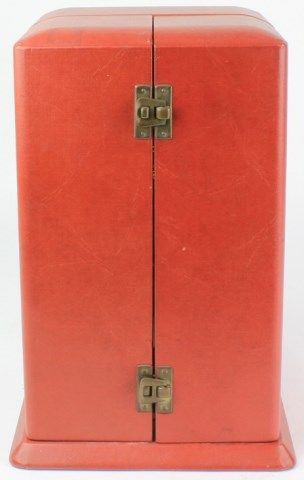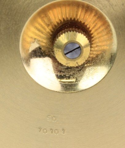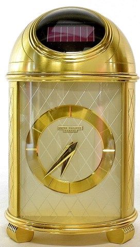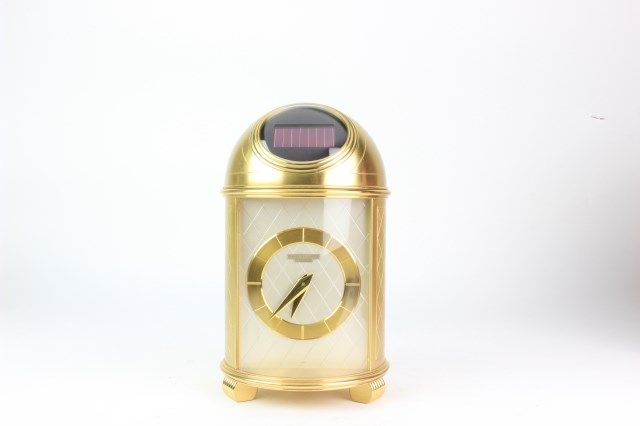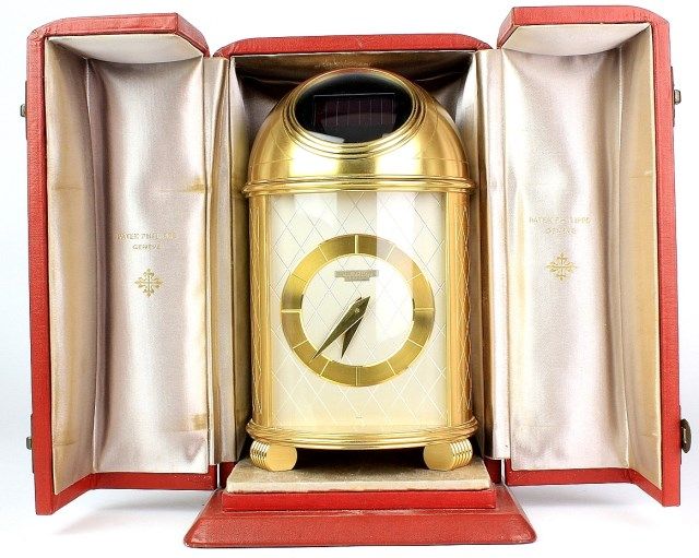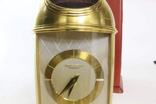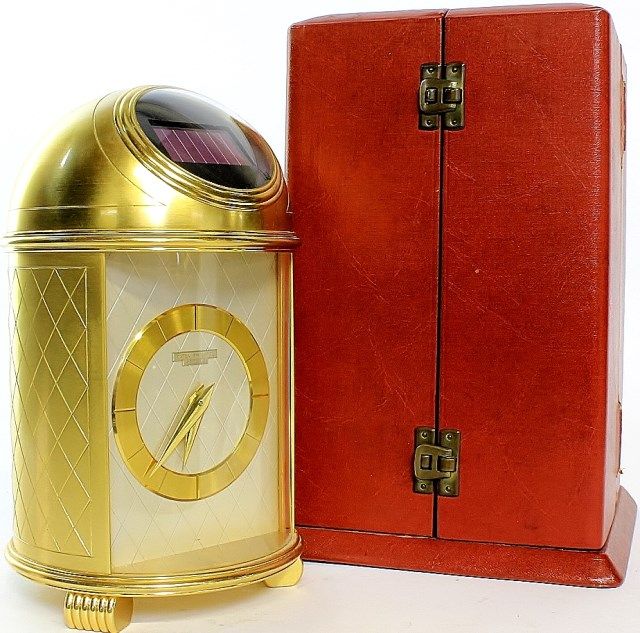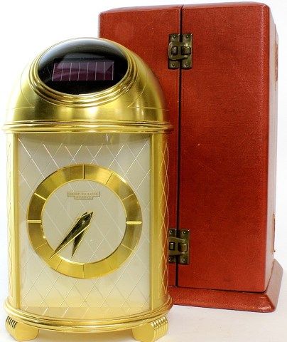 with original presentation case in gilt brass showing diamond quilted pattern to back panel and the matte silver face on 3 cylindrical feet. Bottom is numbered 90 and 70101 the revolving dome top with solar panel clock 8 1/2" tall showing very good condit