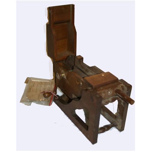 This patent model comes with a tag which identifies it as No. 244,494, Soule & Packard Machine for Making Cut Nails, July 19, 1881. There is further information explaining the claim and operation of the machine along with schematics of the proposed machine. The overall dimensions are approximately 4 ½" x 10" x 7 ½" H.
