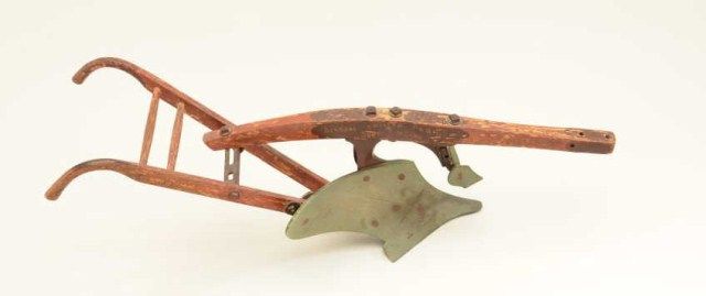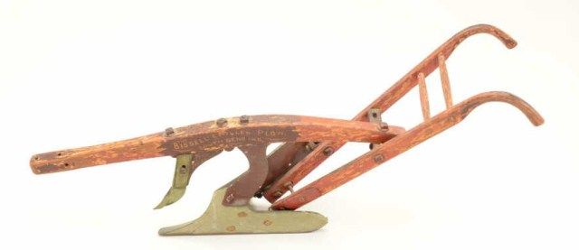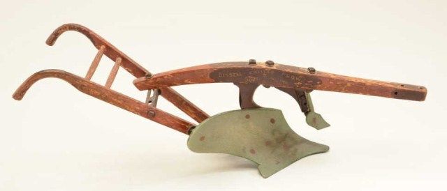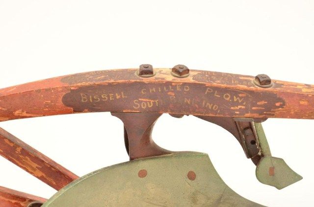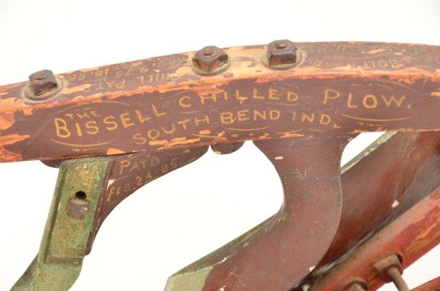 Patent Model or Salesman’s sample miniature plow marked “The Bissell Chilled Plow, South bend, Ind.” with patent mark February 24th 1885. The miniature measures 21-1/2” overall and is about 1/3 scale with a 7” steelblade. The plow is nicely made with wood and screws. The wood is painted and marked like full size model. The condition is good to very good with about 50% paint, normal aging. This fine antique was displayed with “TheBissell” engraved 1873 Winchester which was made for the owner of this company. Est.;$750-$1,500.
