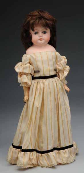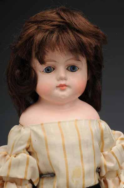 Description Germany, Ca. 1890. Papier-mache shoulderhead, paperweight glass eyes, rosy cheeks, closed mouth, vintage brown mohair wig. Original cloth body with composition lower arms and legs painted blue socks and black shoes. Redressed. Condition (Excellent). Size 20" T.