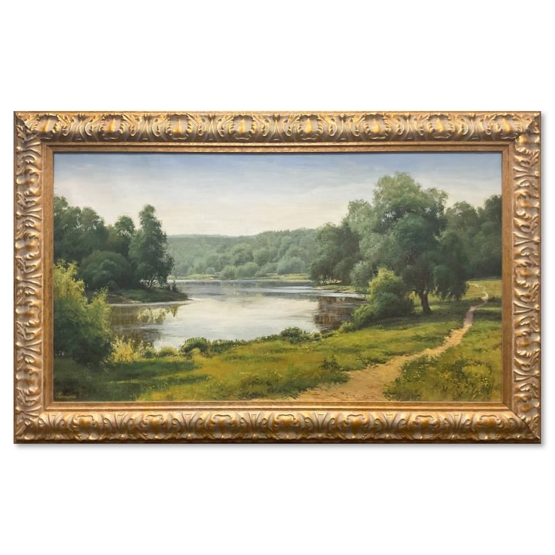 "Path by the River" is an original oil painting on canvas by Igor Prishepa, hand signed by the artist. This piece comes framed. Includes Letter of Authenticity. Measures approx. 26" x 41.5" (frame), 19" x 34" (image). There is some wear on the frame.