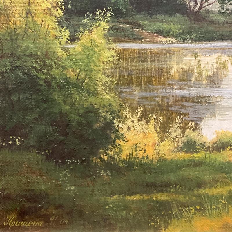 "Path by the River" is an original oil painting on canvas by Igor Prishepa, hand signed by the artist. This piece comes framed. Includes Letter of Authenticity. Measures approx. 26" x 41.5" (frame), 19" x 34" (image). There is some wear on the frame.